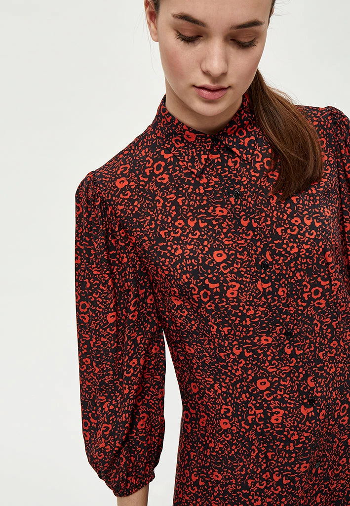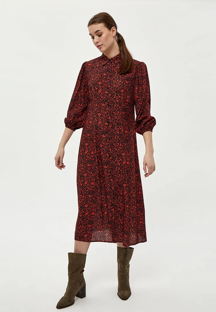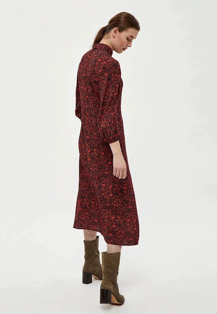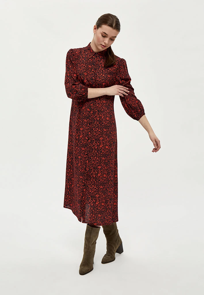 Long and flowy dress with a lovely print. The dress has a collar and is closed by buttons.