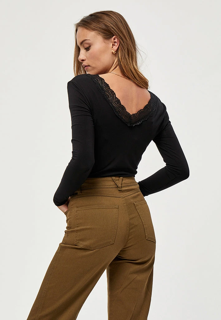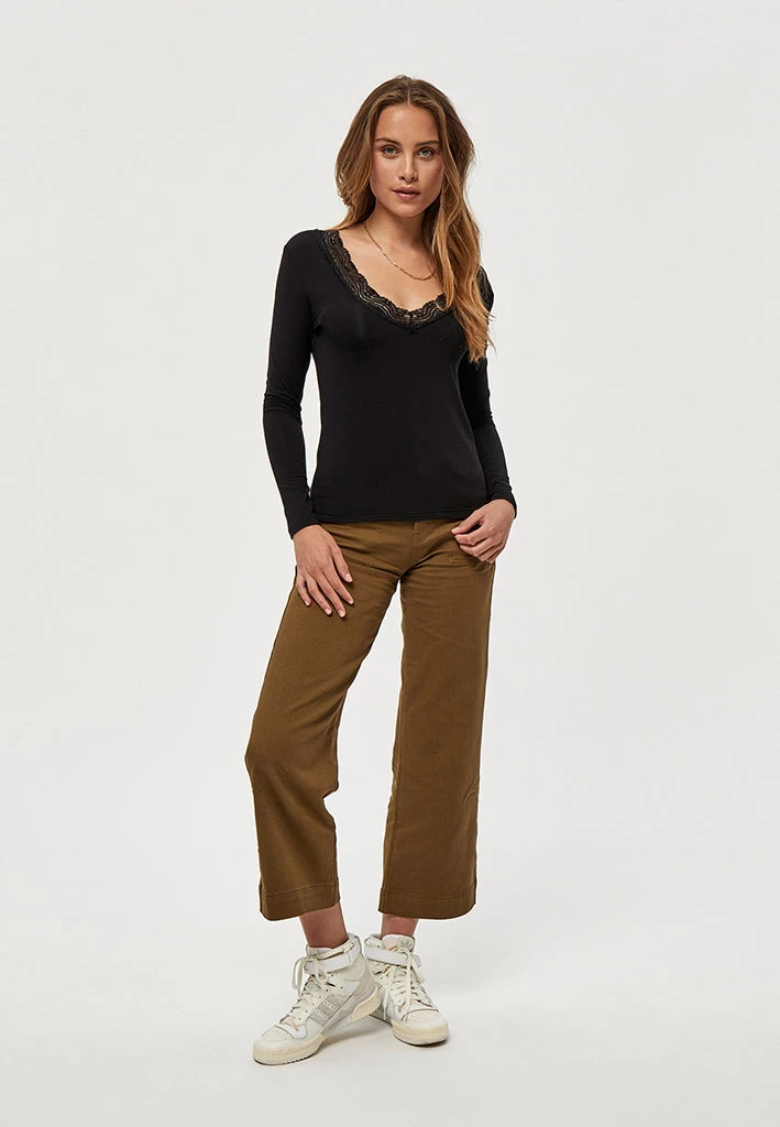 Lovely blouse with lace v-neck. The blouse is tightly fitted. It is easy to style with jeans or pants.