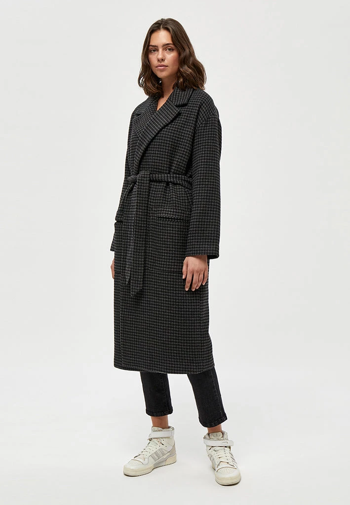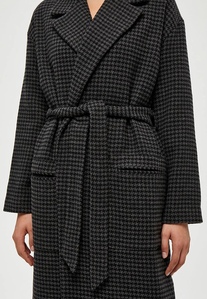Lovely jacket with a cool print. The jacket is long. It has a big collar and a belt to tie at the waist.
