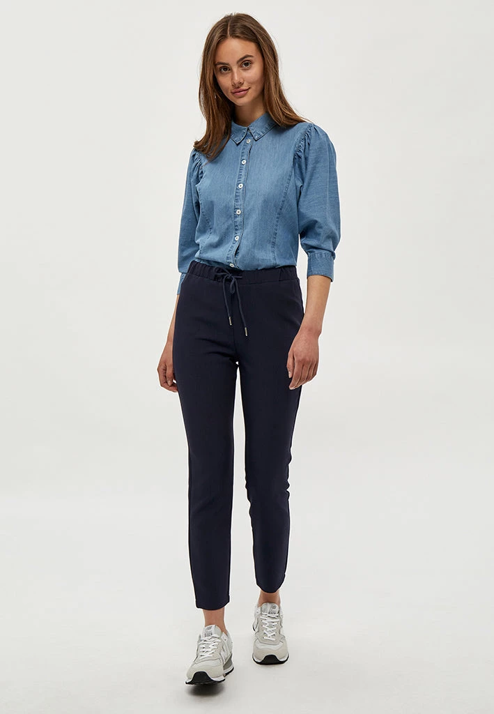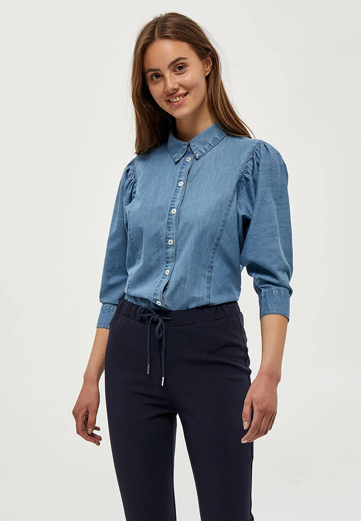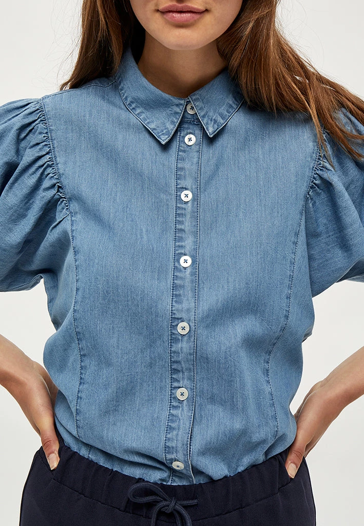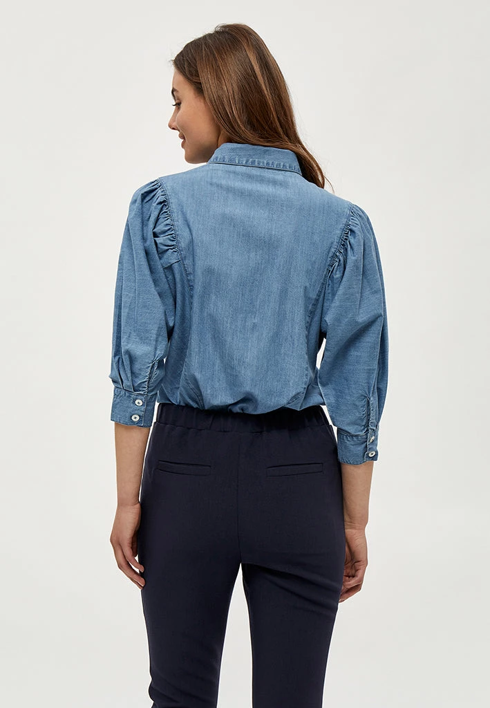 Cool denim shirt. The shirt has a collar and button closure. It has 3/4 sleeves with puf.