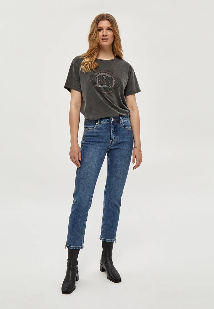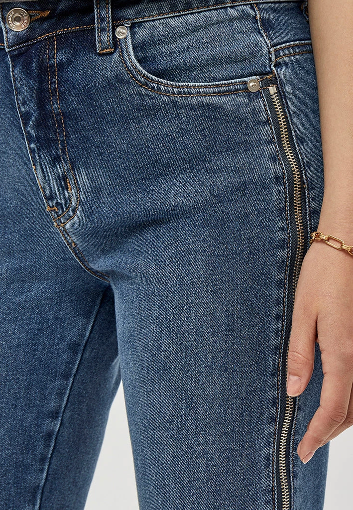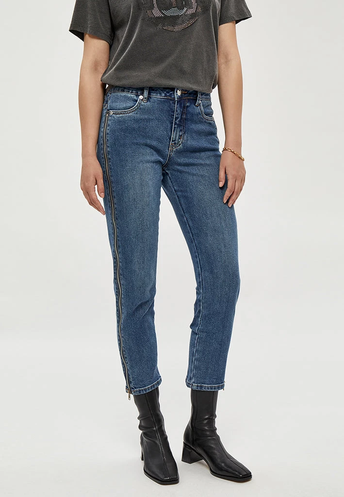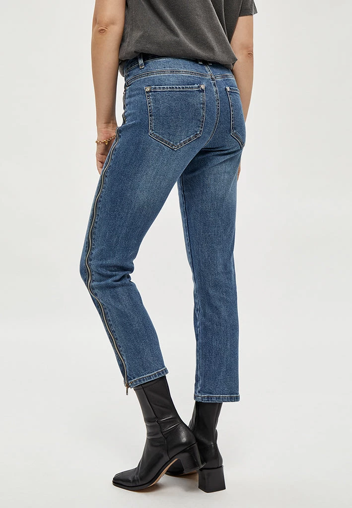 Cool denim jeans. The jeans have both front and back pockets. They have a cool zipper detail down the legs.
