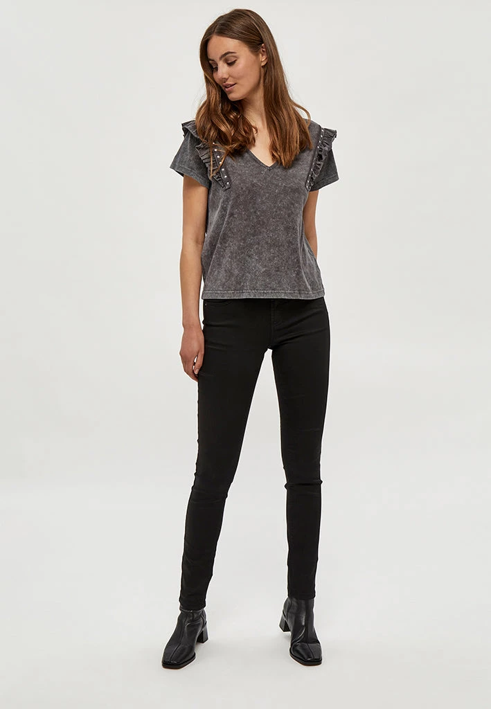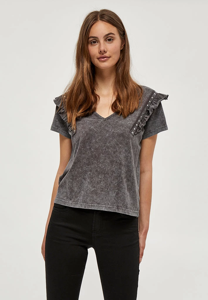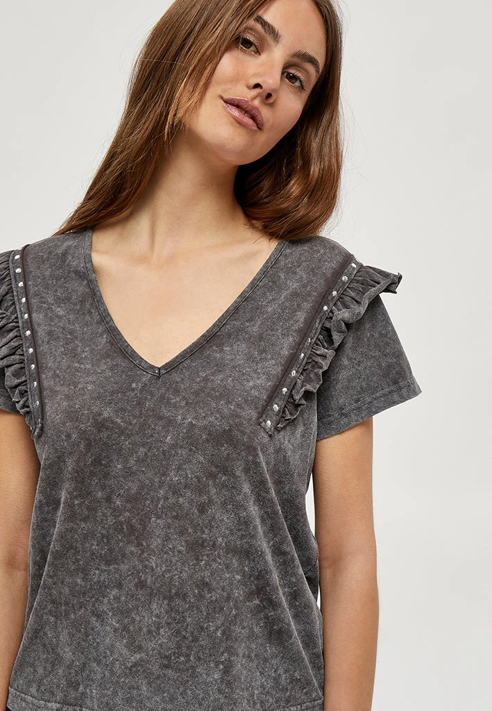 Cool tee with v-neck. The tee has nice shoulder details with ruffles.