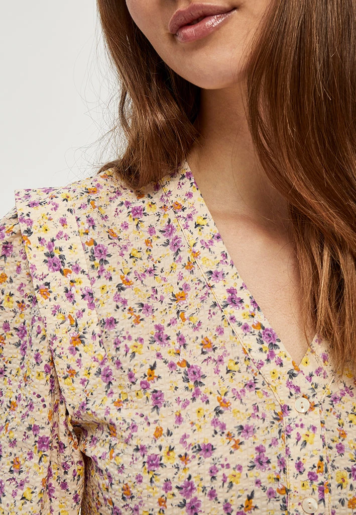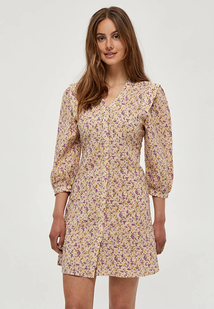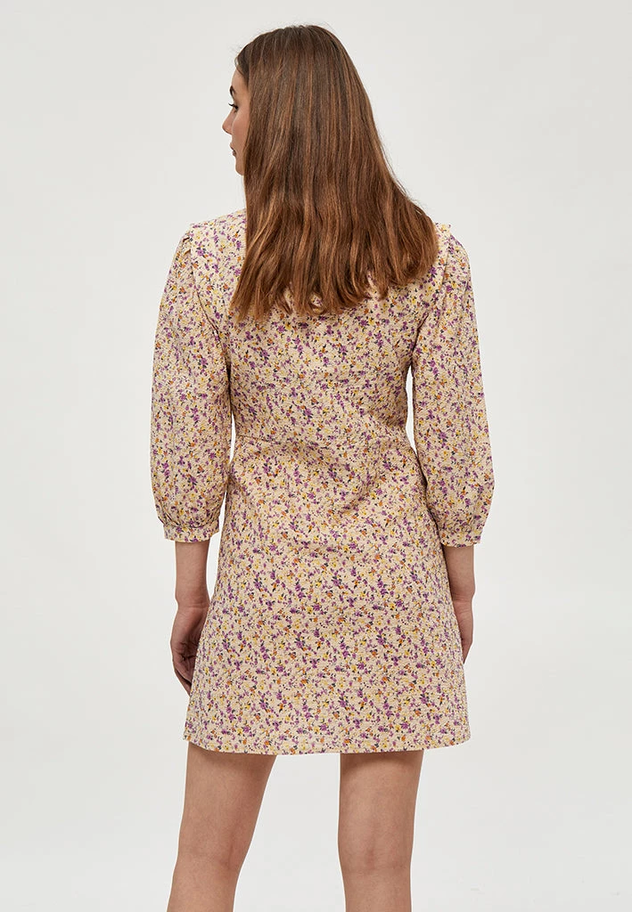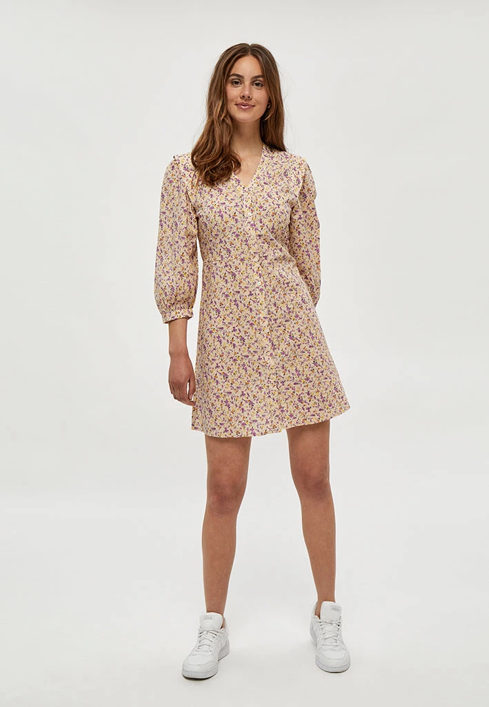 Lovely dress with flower print. The dress has a v-neck and 3/4 sleeves. It has a lovely detail on the shoulders. The dress is closed by buttons.