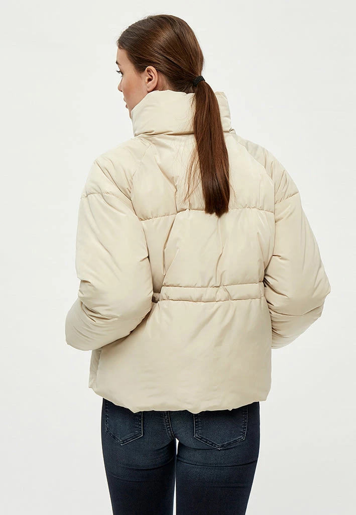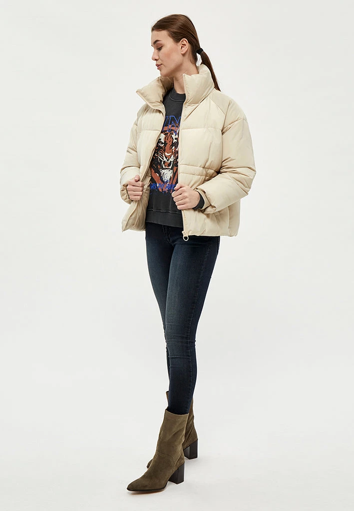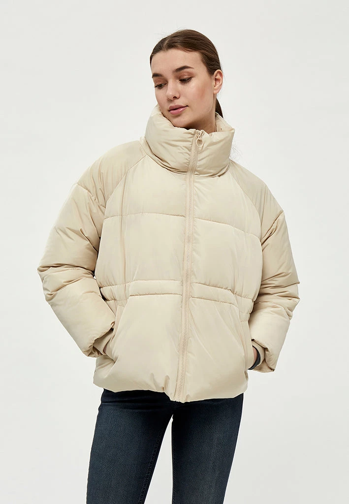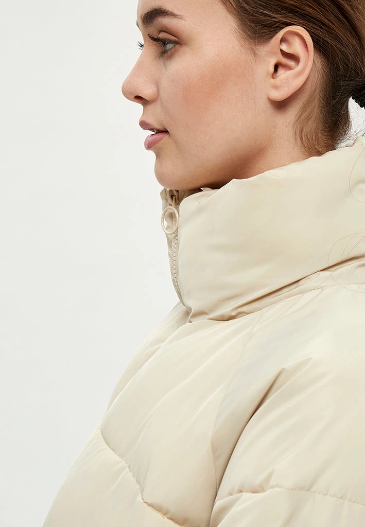 Cool puffer jacket with a high neck. The jacket is really comfortable and can keep you warm. It is closed by a zipper and has side pockets.