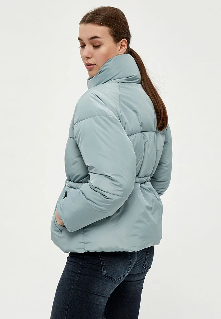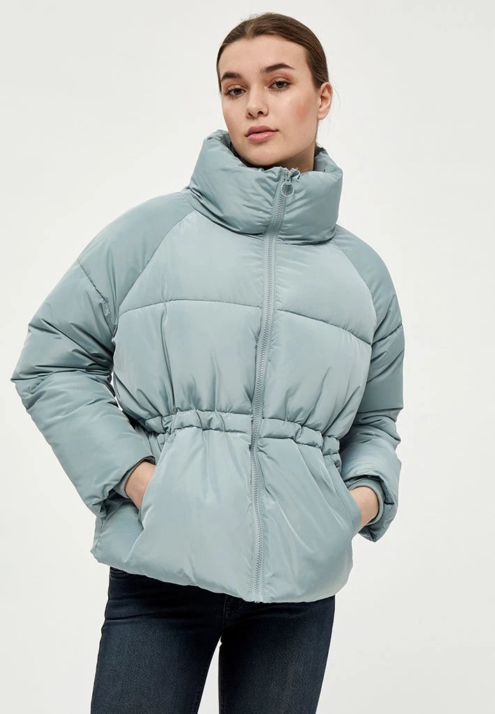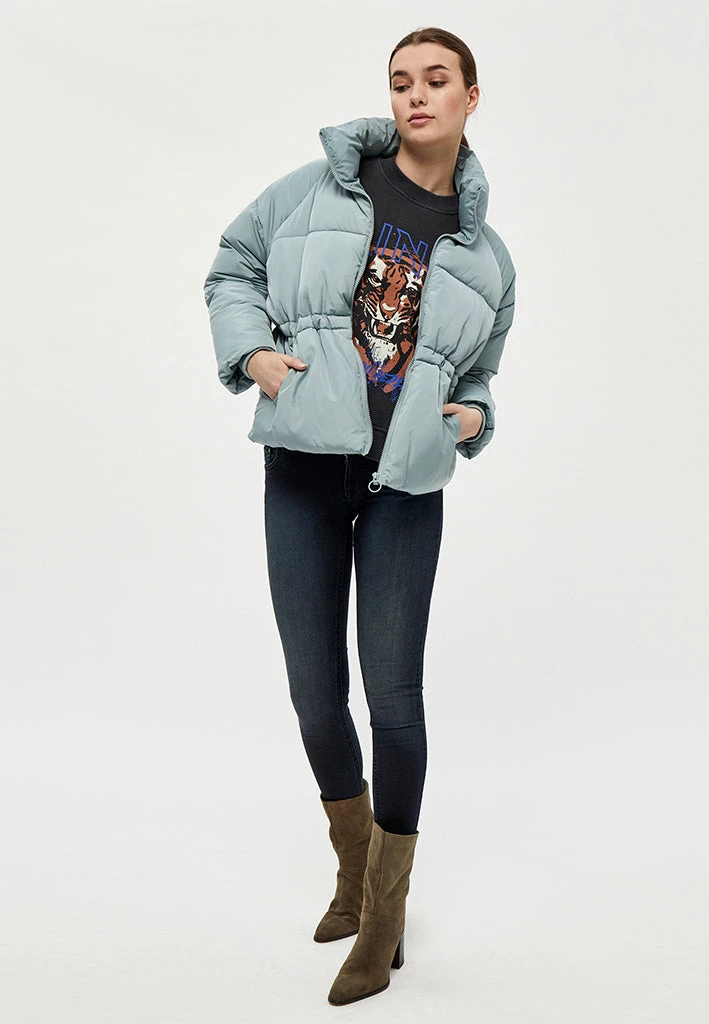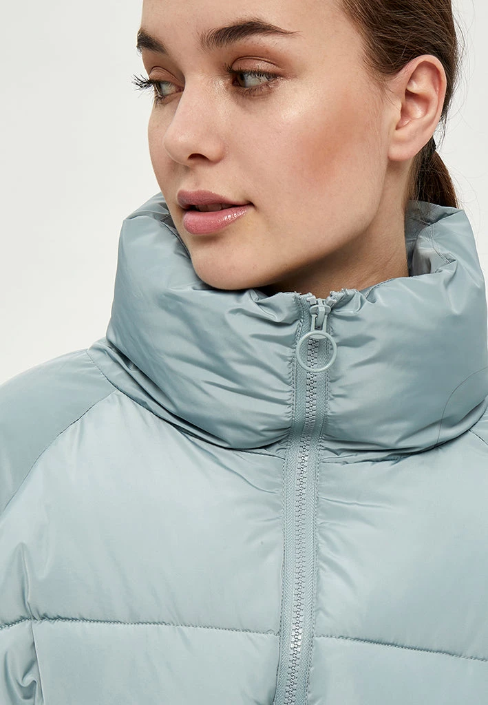 Cool puffer jacket with a high neck. The jacket is really comfortable and can keep you warm. It is closed by a zipper and has side pockets.