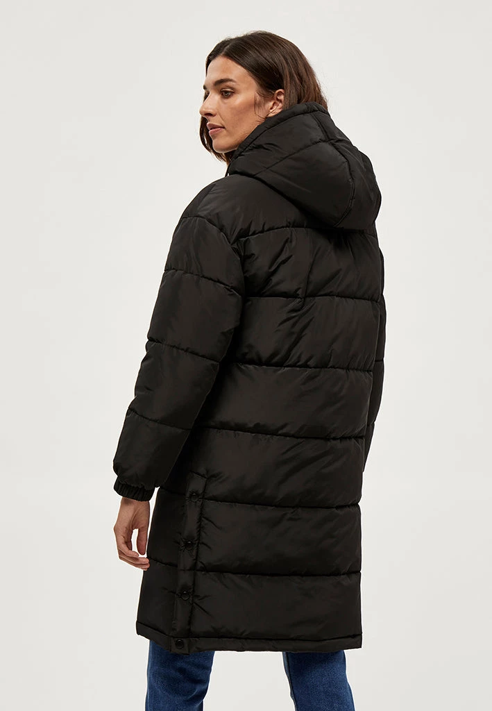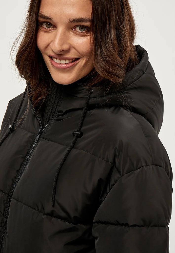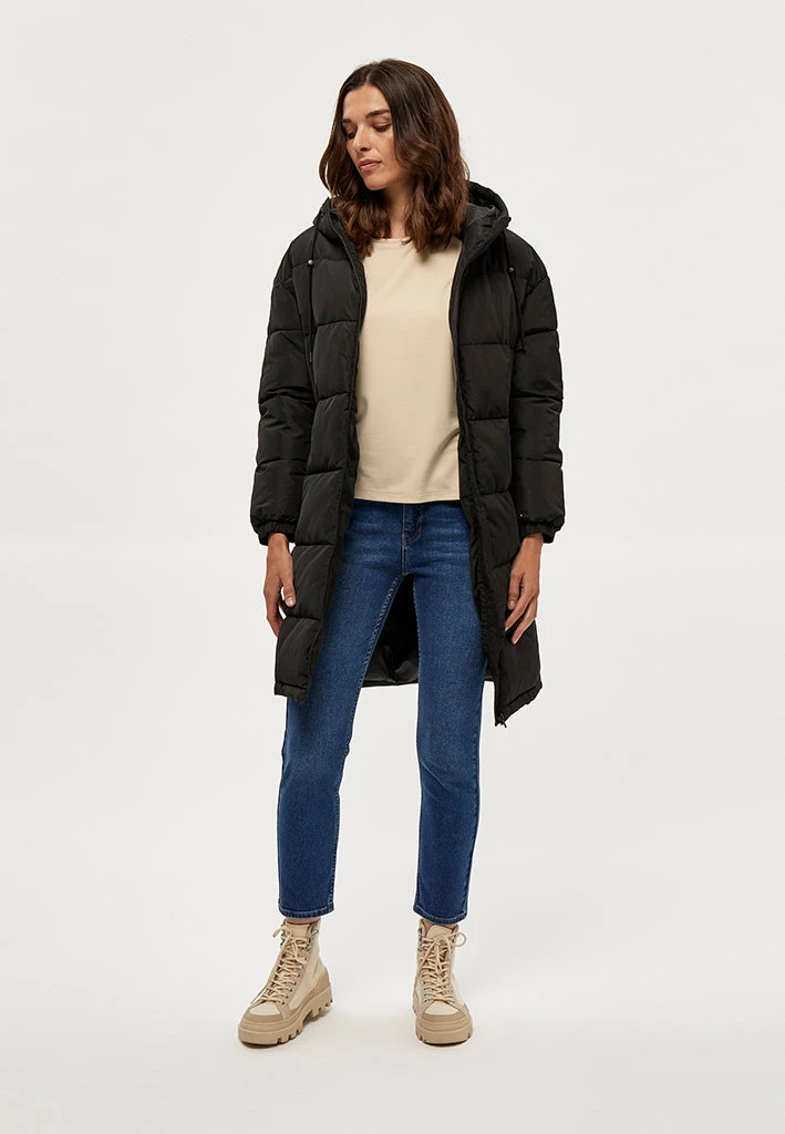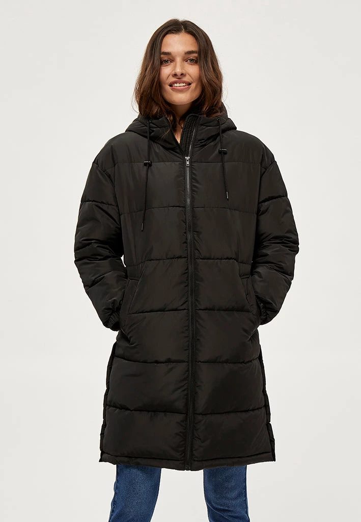 Long and comfortable jacket. The jacket has side pockets, a hood and is closed by a zipper.