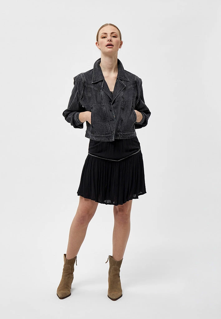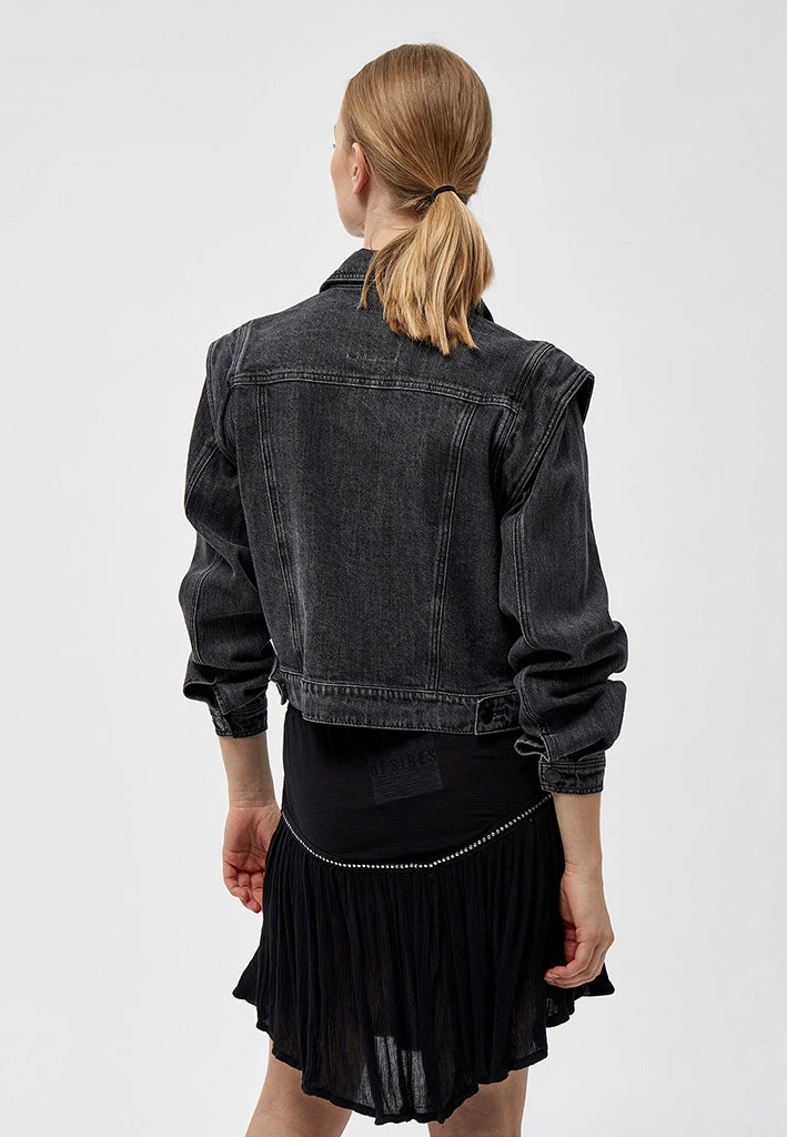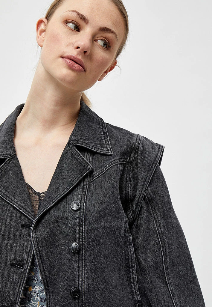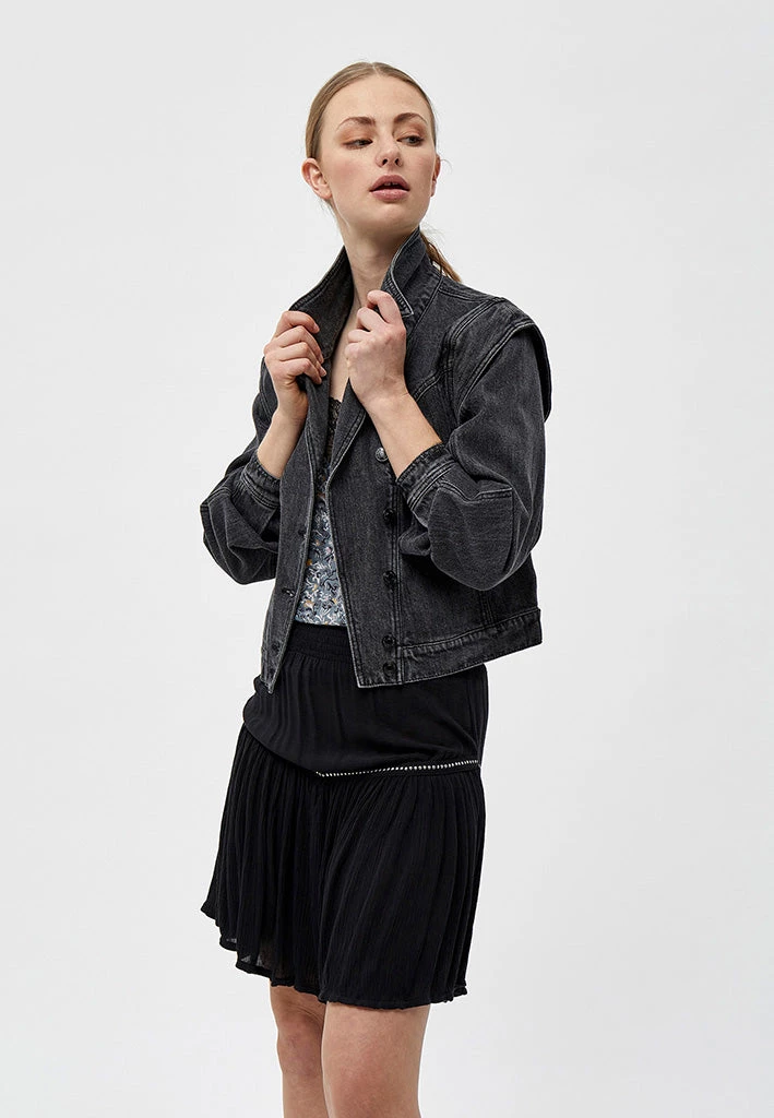 Black denim jacket with cool sleeves. The jacket has an oblique button closure. It has a collar. The jacket is easy to style.