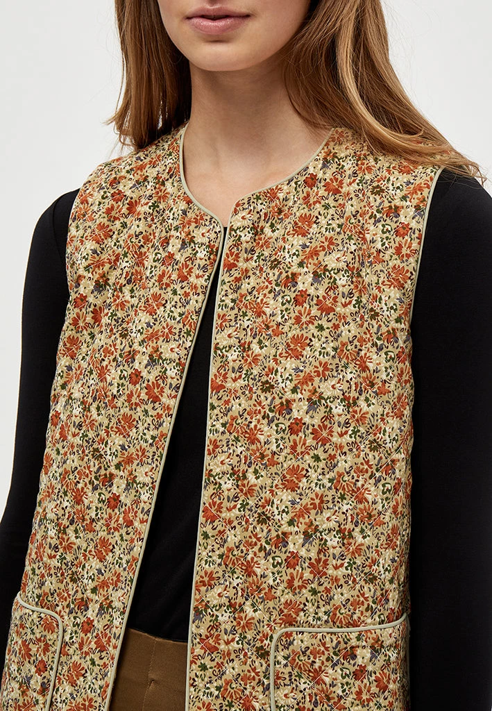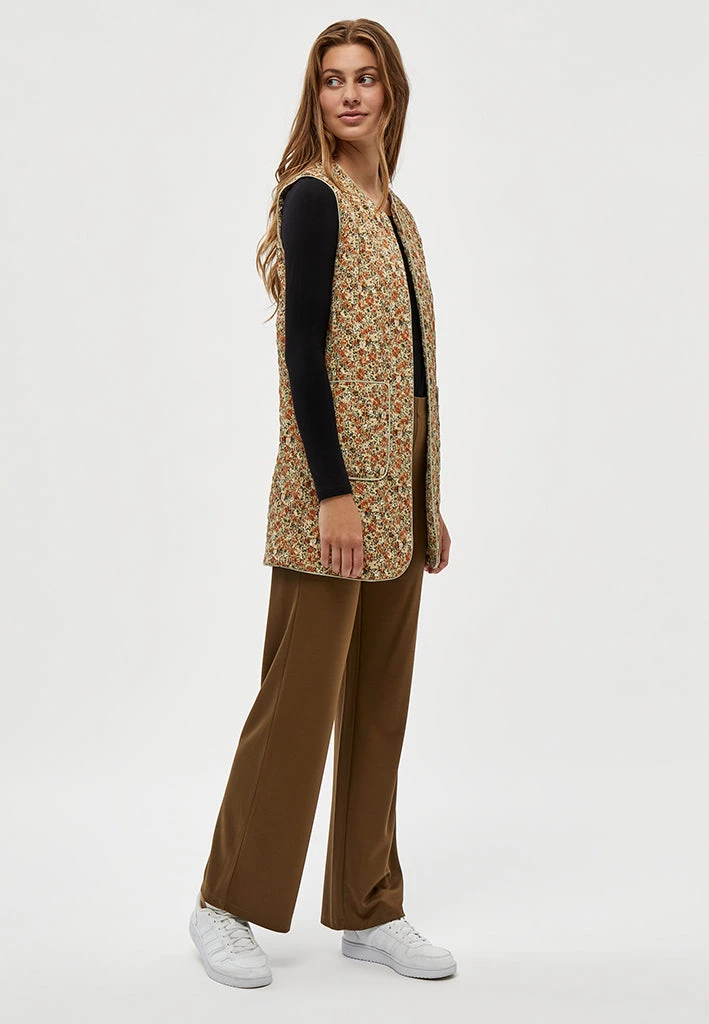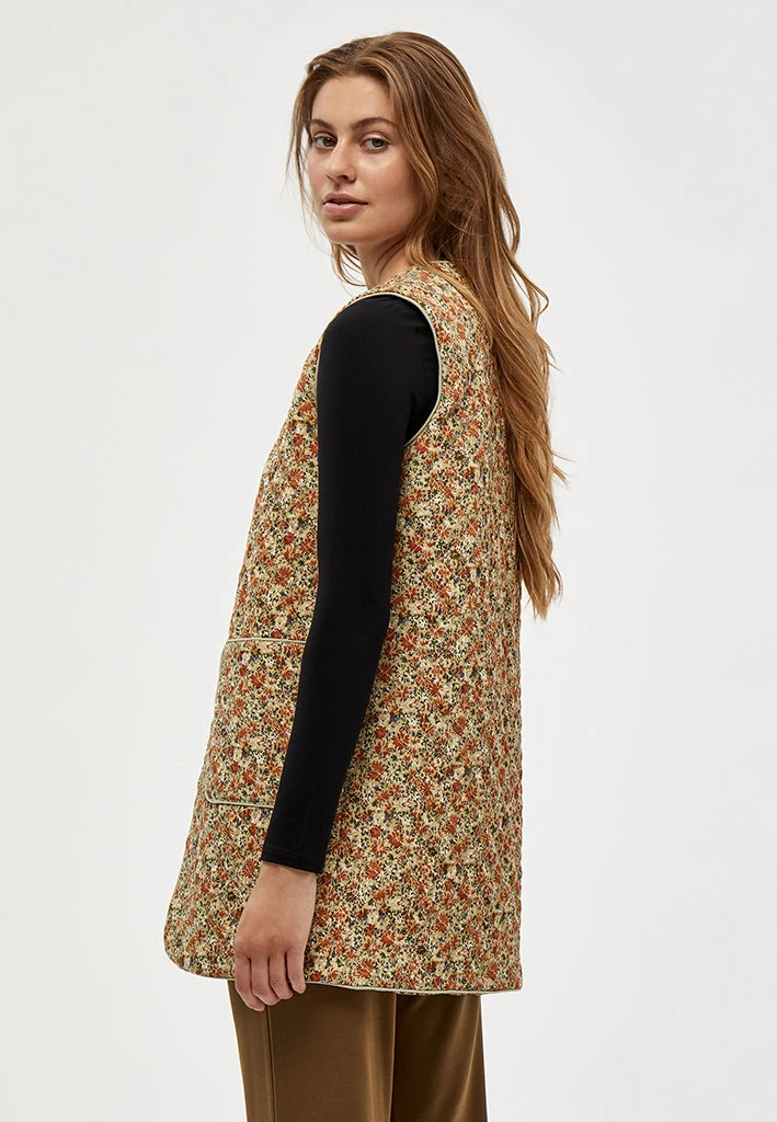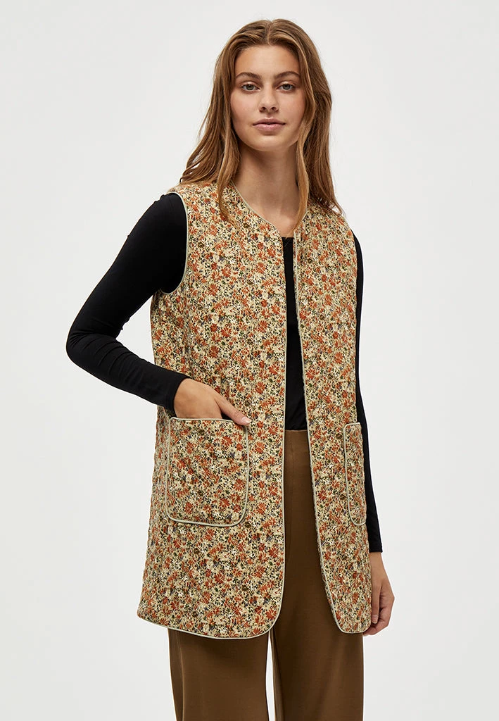 Lovely long vest. The vest has a beautiful flower print. It has side pockets. The vest can be used inside or as a jacket.