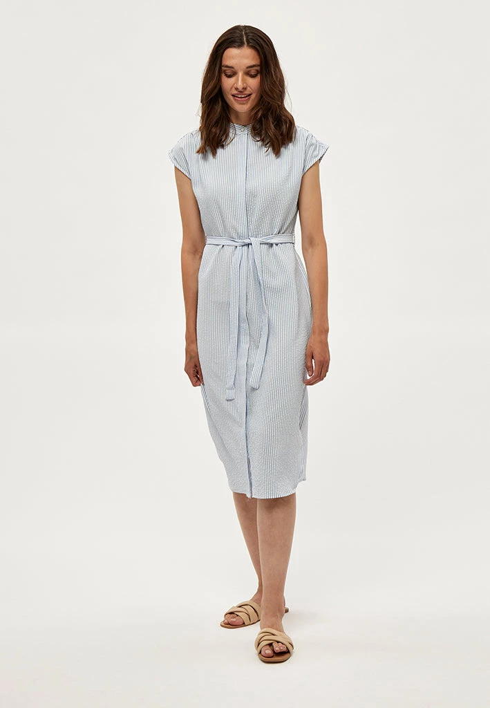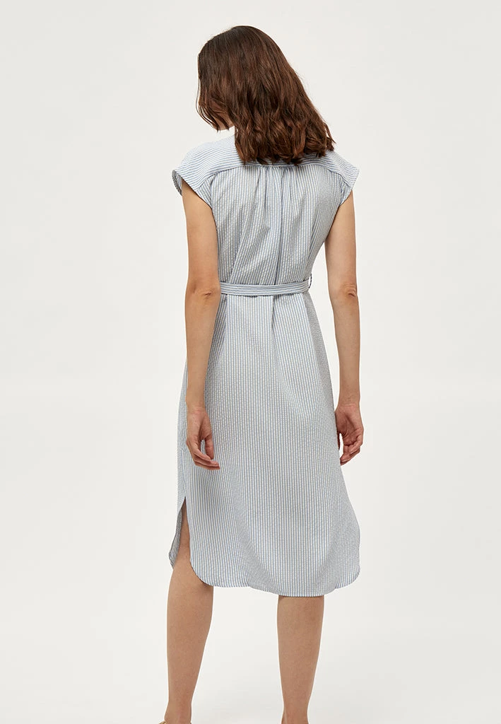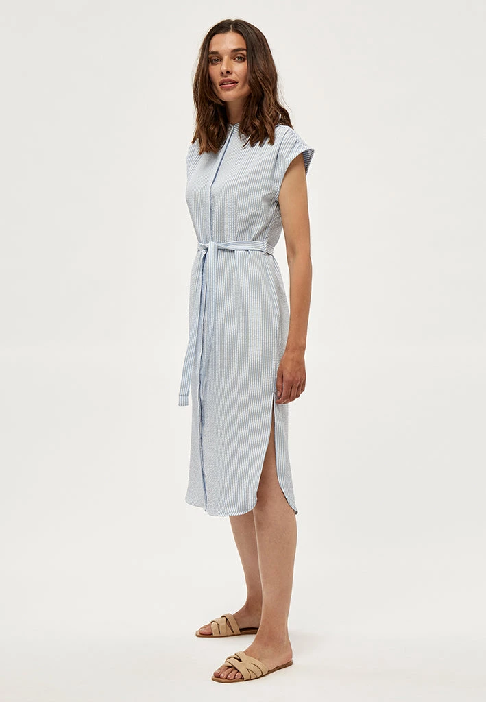 A beautiful dress with texture. It has nice details such as a pearl button at the top, slits in each side, buttons all the way down and you tie the dress around the waist.