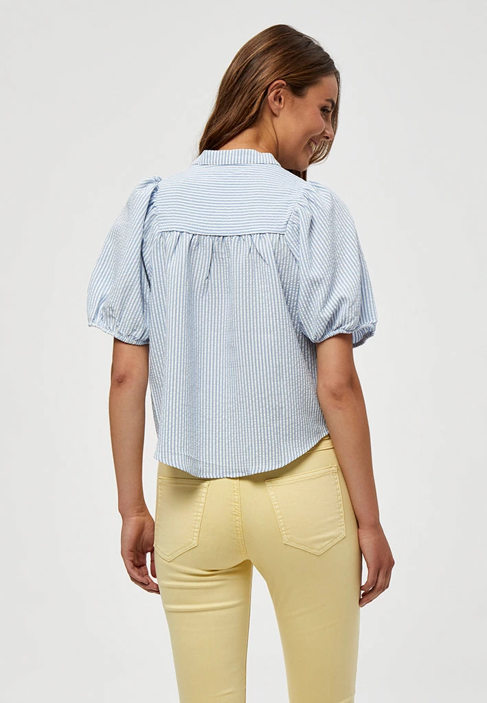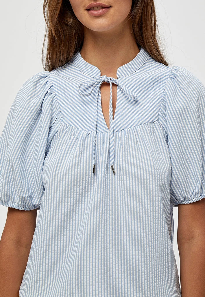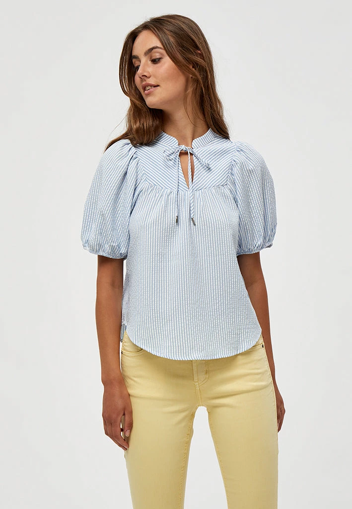 Jada Top is a striped top with ruffles on the sleeves as well as elastic bands to make them slight puffed. It has a v-neck that you can tie as well.