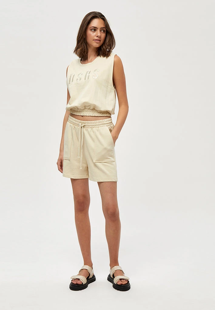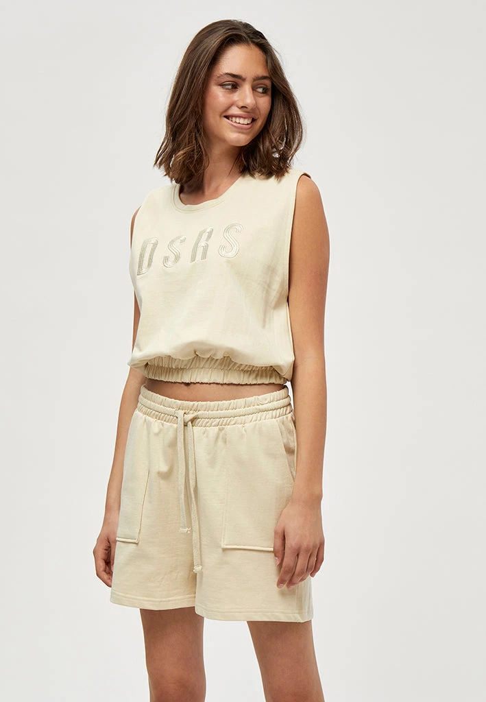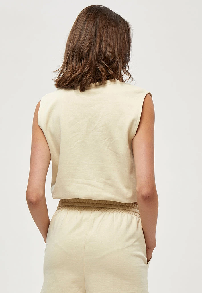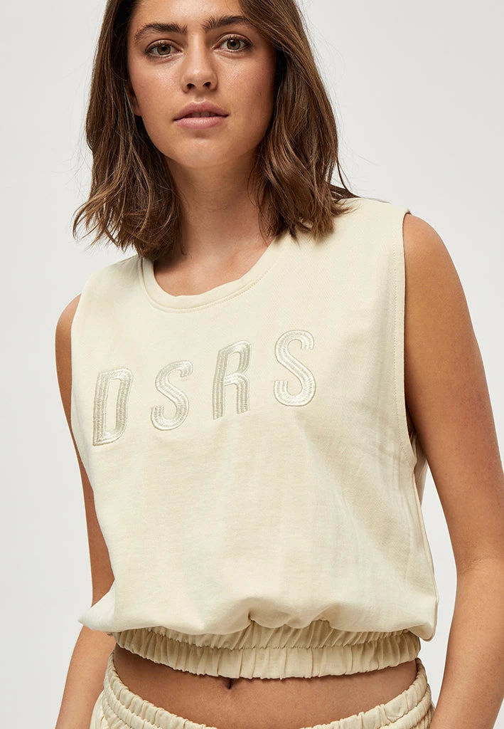 Cool sleeve less tank top with a wide rib on the buttom. It has a round neck and logo on the front.