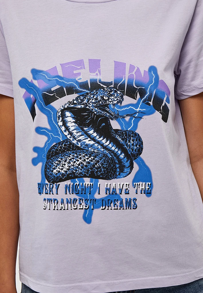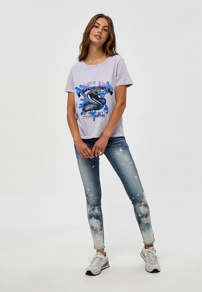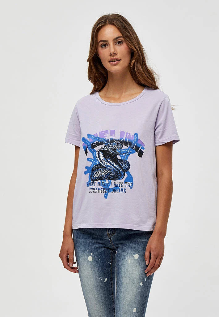 Jaden Tee is a purple tee with a cool print on the front and a round neck. It is made from 100% cotton which makes the t-shirt iron-free.