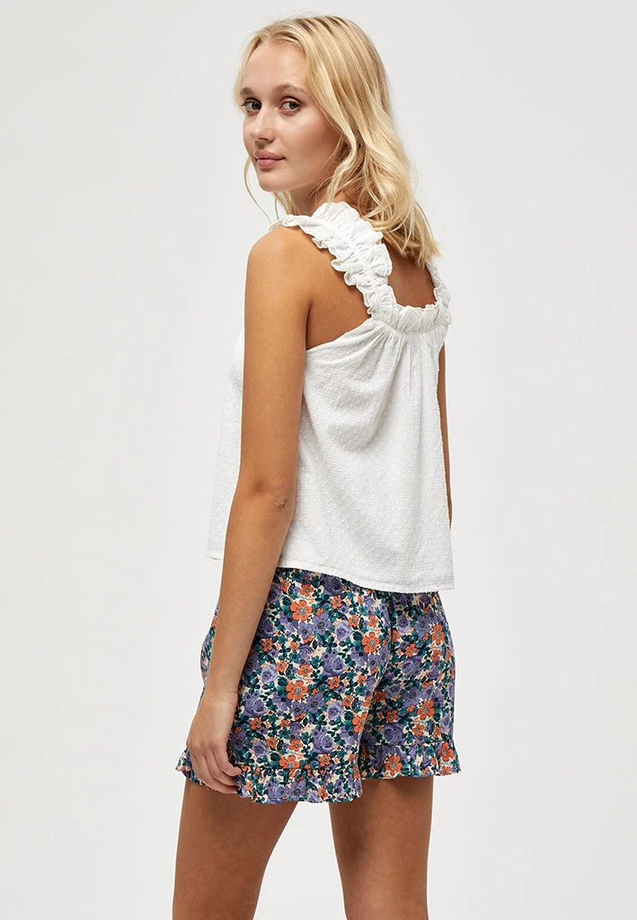 The Janet Top is a beautiful top with ruffles at the top which gives a nice and feminine texture. It has an open neckline which adds to the feminine look.