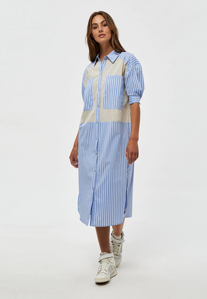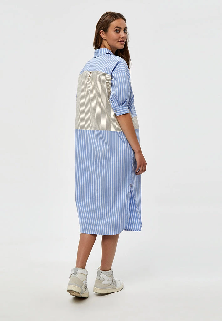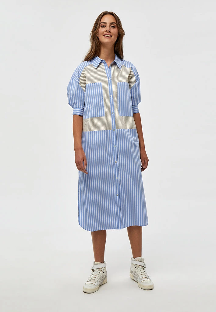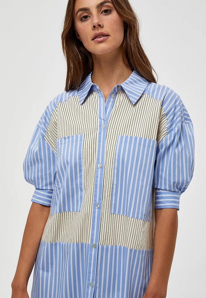 A beautiful colorblock shirt dress with stripes. It has pockets in the front, cufflinks on the sleeve and a classic collar. The sleeves are slightly puffed.