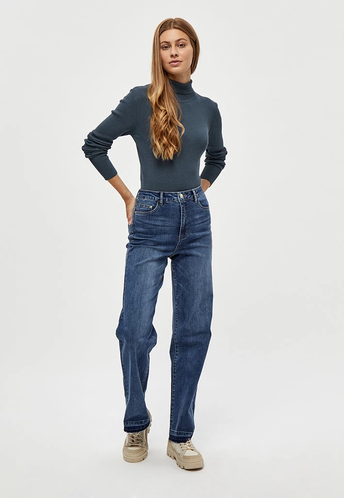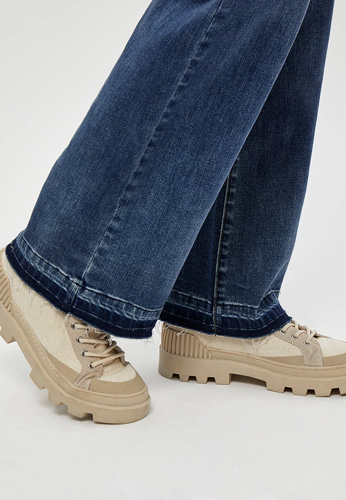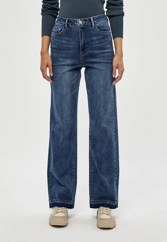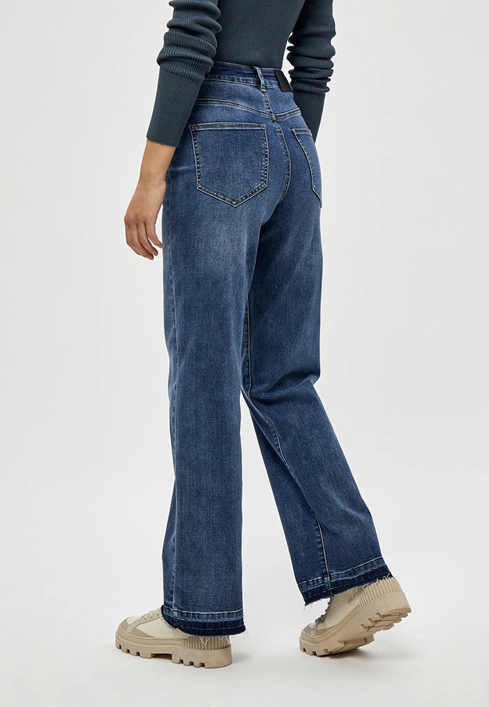 Cool high waisted jeans. The jeans have both front and back pockets. They have beltstraps and a button. The jeans have flare. They have a darker edge at the bottom.
