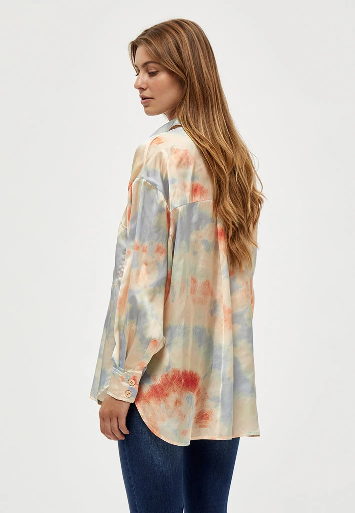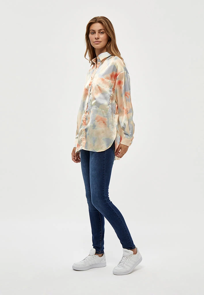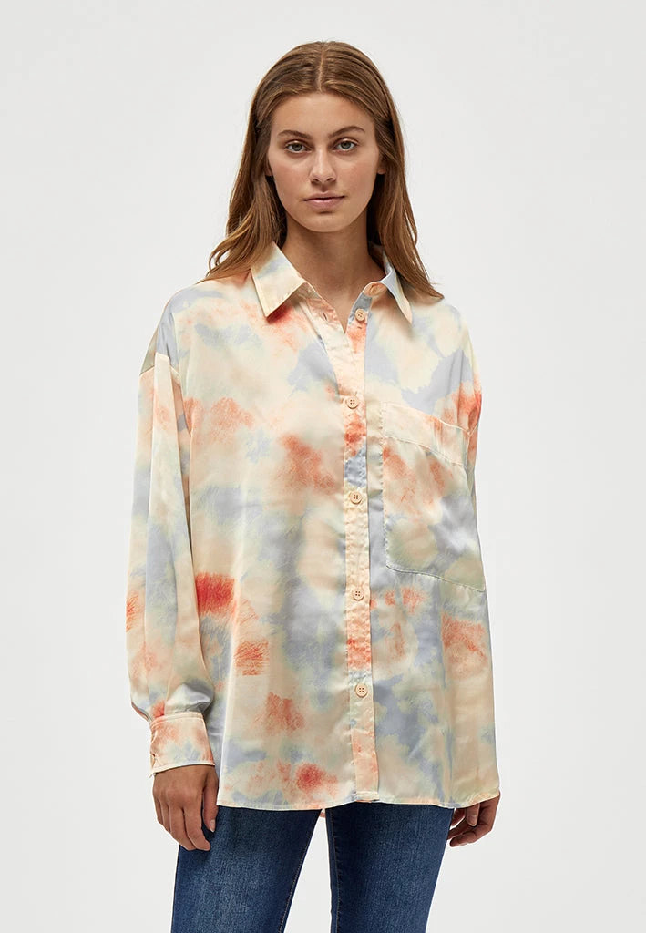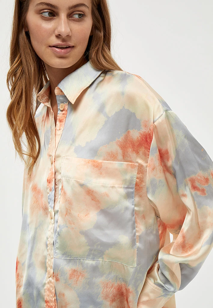 Beautiful oversized shirt in a colorful pattern which still gives it a feminin look. It has a classic collar and cuffs on the sleeves. It closes with buttons on the front and has one big pocket in front as well.