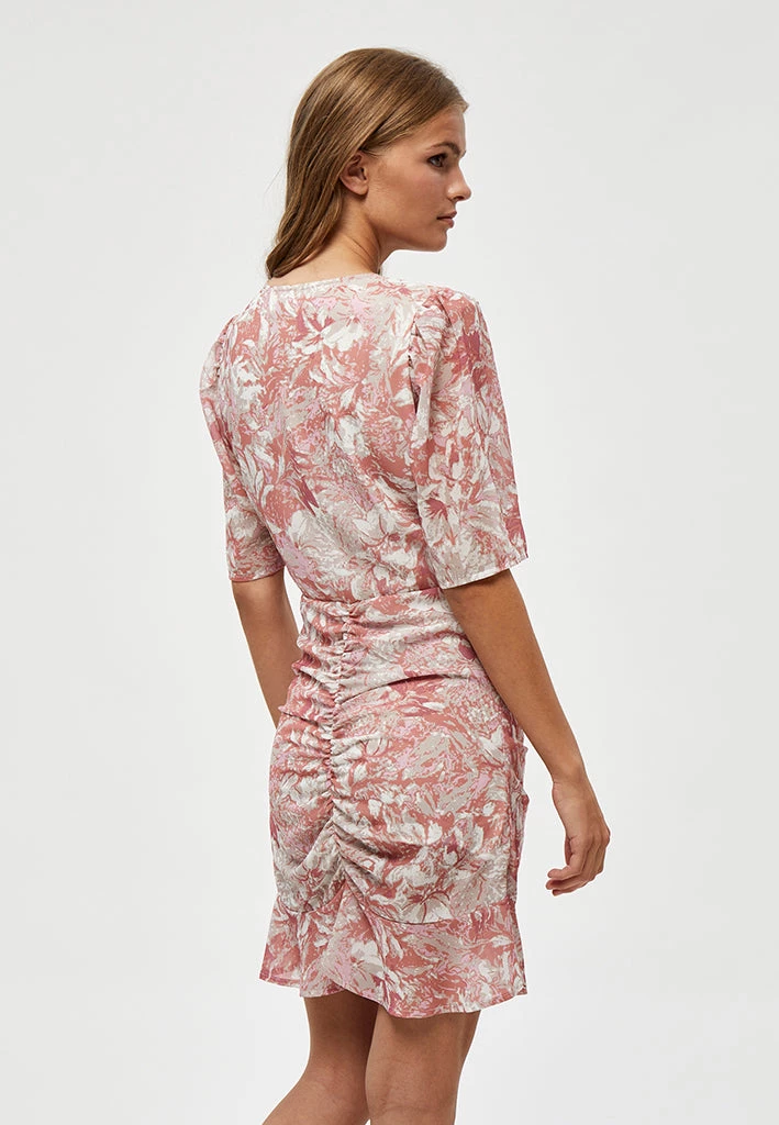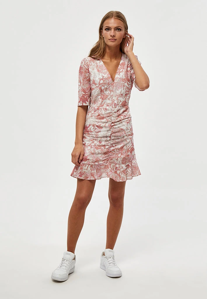The Jenessa Dress is the perfect feminine dress which is so flattering for the body. It is scrunched from the waist and down with frills at the end. The dress has a v-neckline and a rosa flowerprint.