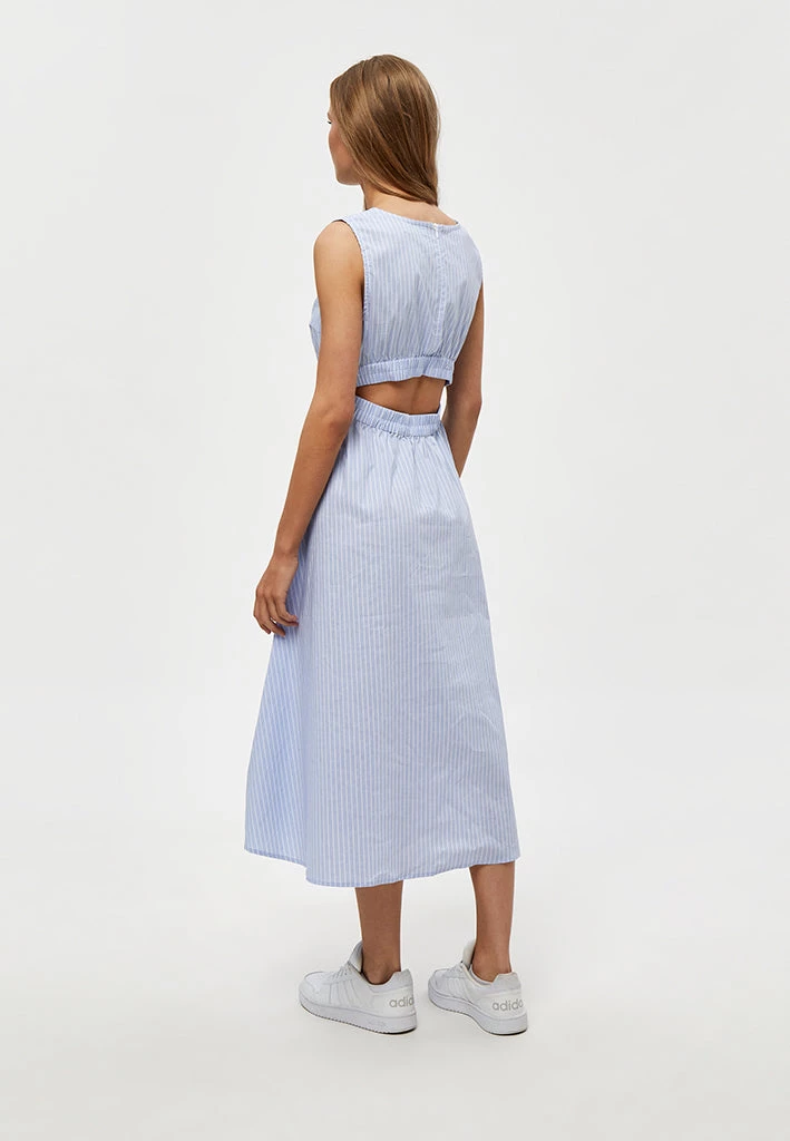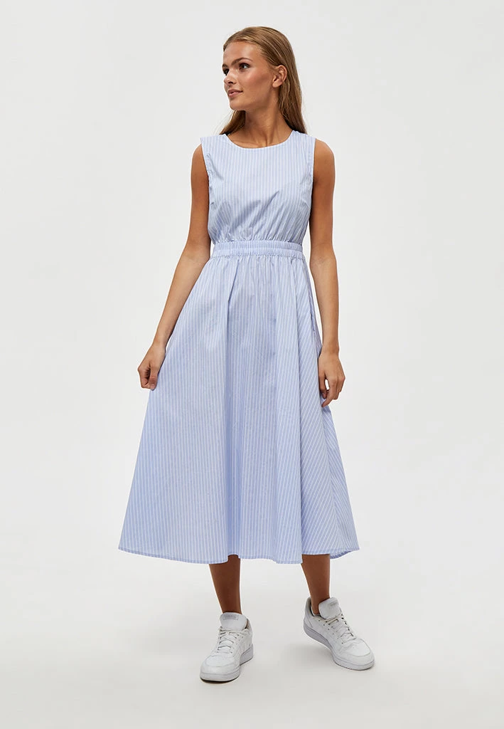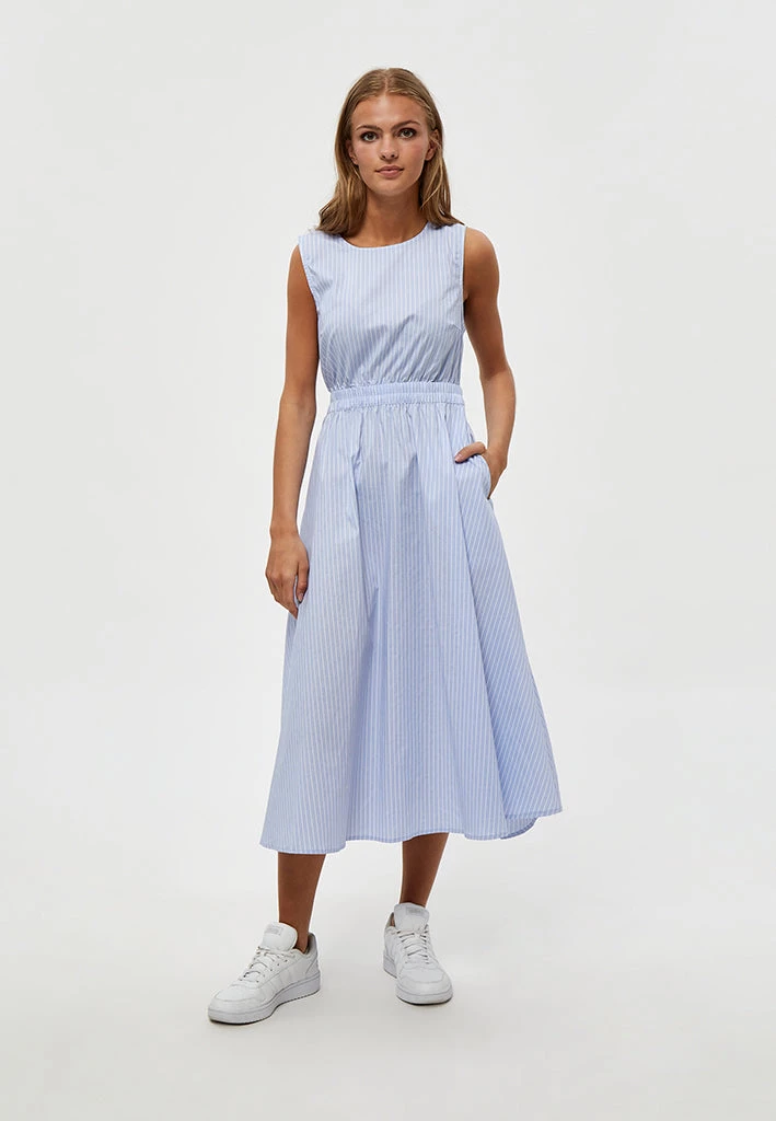 Cute sleeve less maxi dress with smock details at the waist. It has side pockets, a zipper in the back and a round neckline.