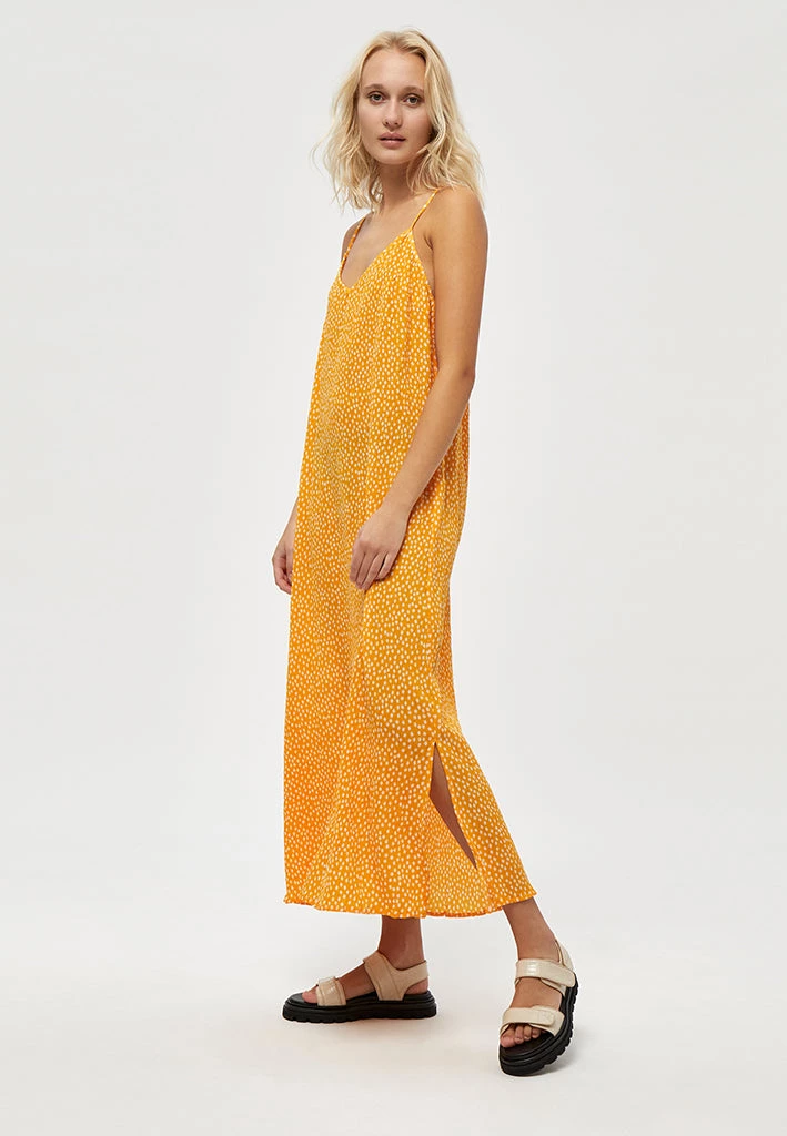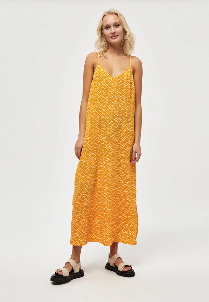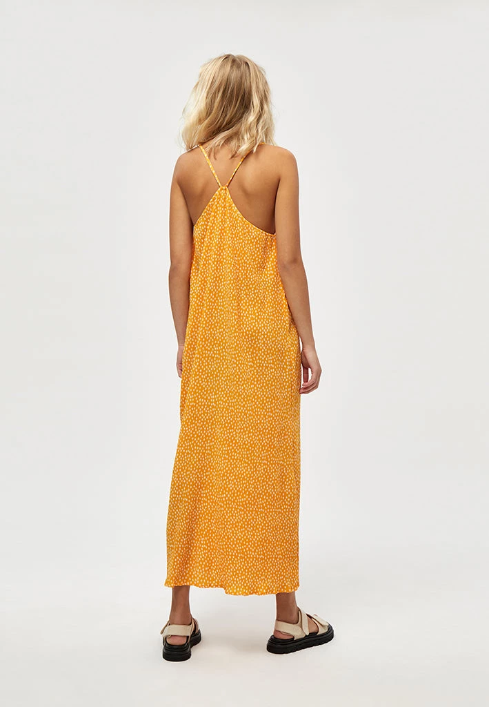 Beautiful long strap dress in a radiant yellow color with a subbtle flowerprint. The dress has a V-neck and crossover back with a special texture. Perfect for spring and summer with its summer touch.