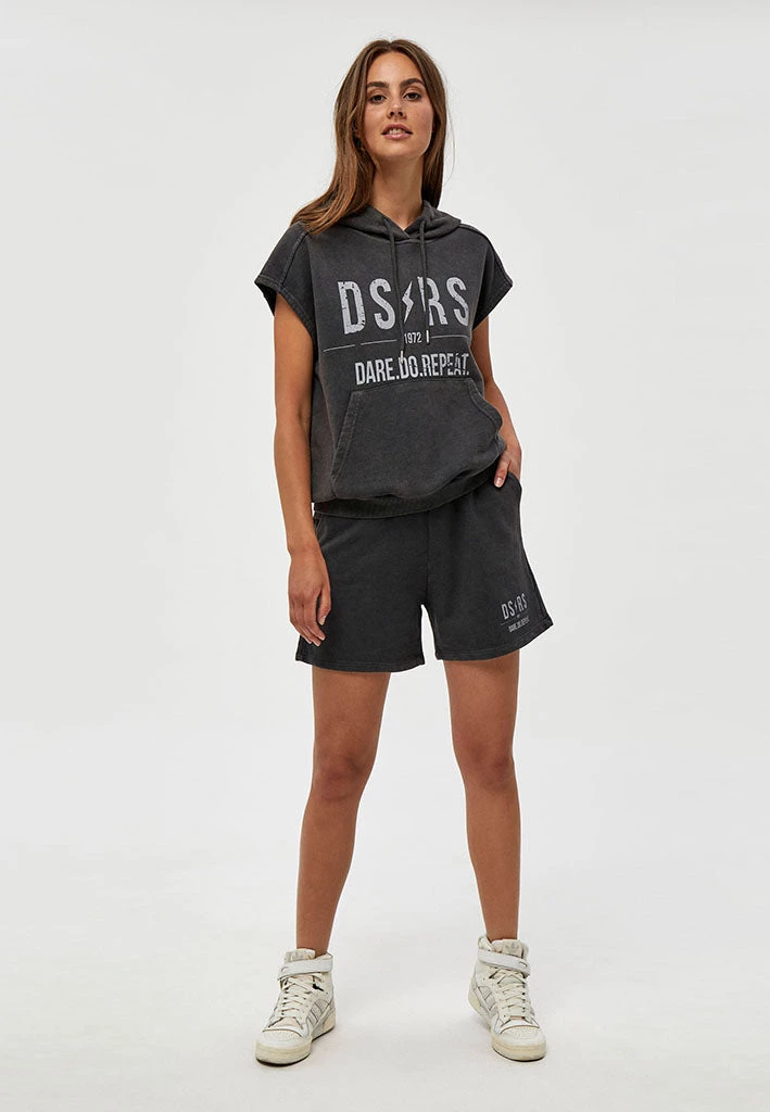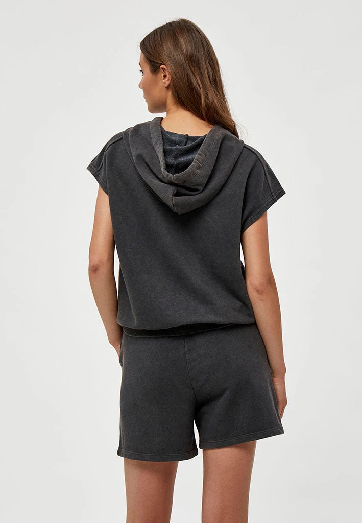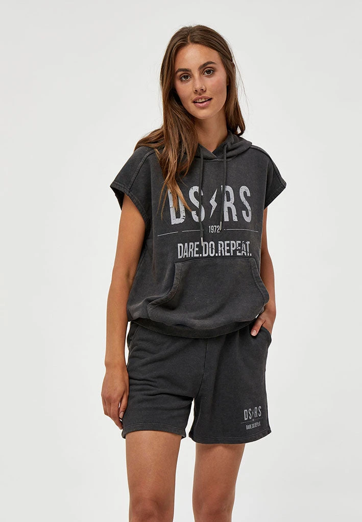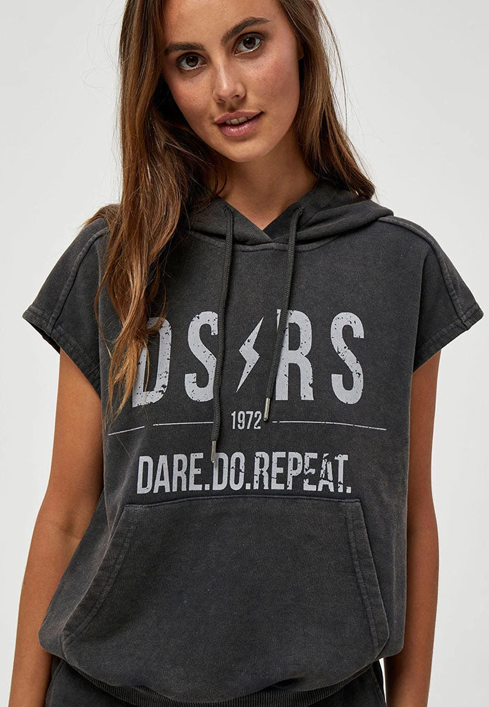 Cool washed black hoodie with no sleeves. It has a statement print on the front as well as a pocket. Perfect for your everyday wardrobe.