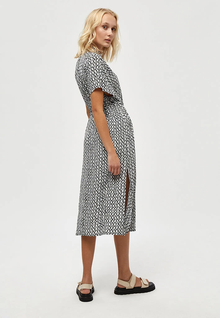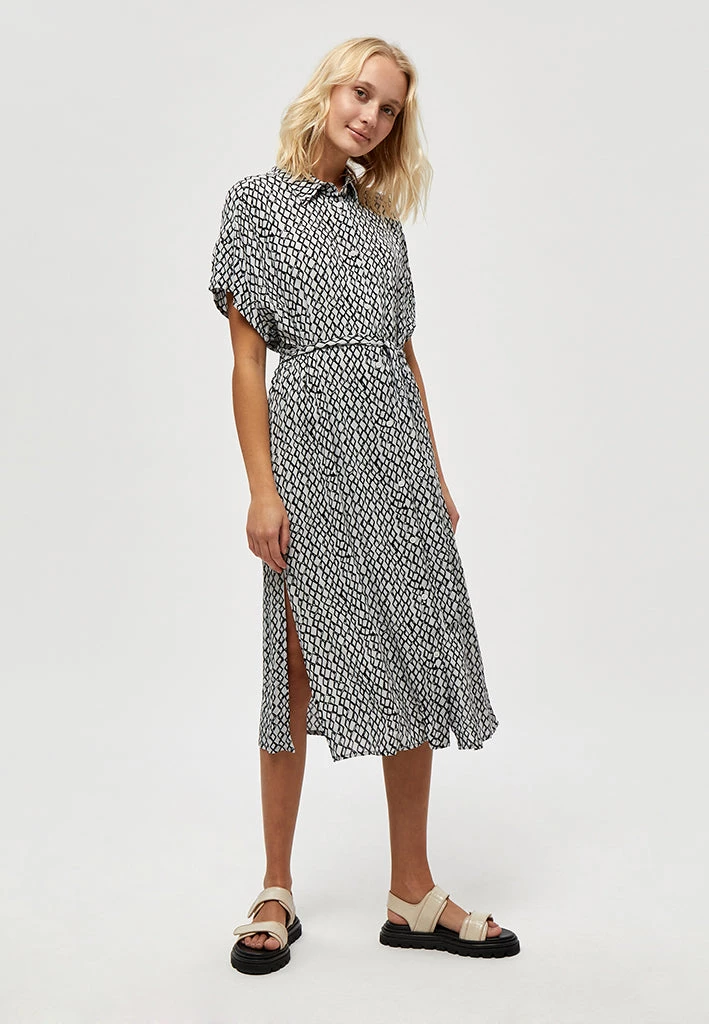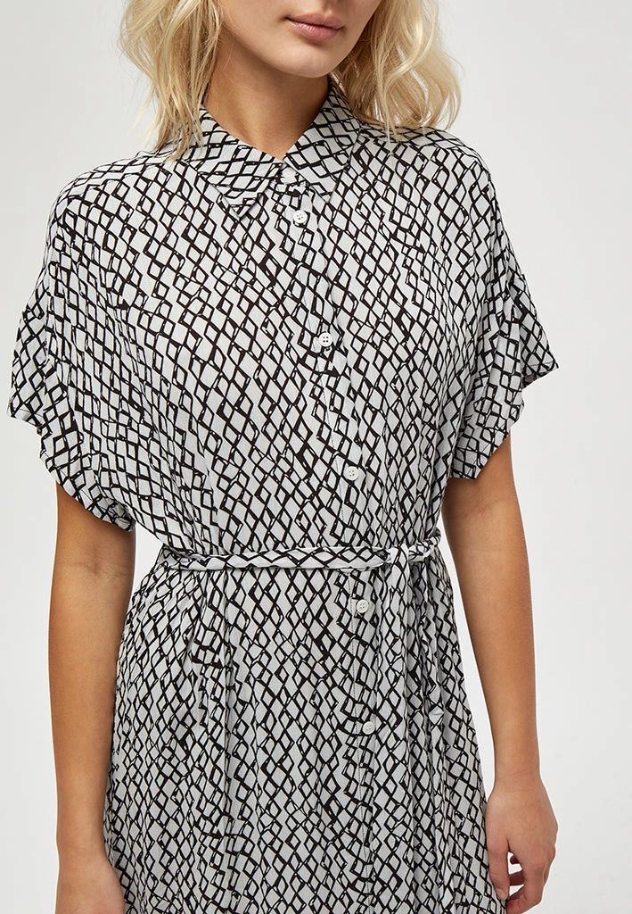 The Judi Dress is a pretty dress that closes with buttons. It has a classic collar and ties at the waist.