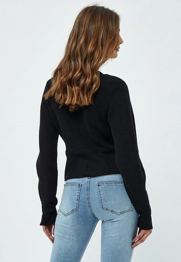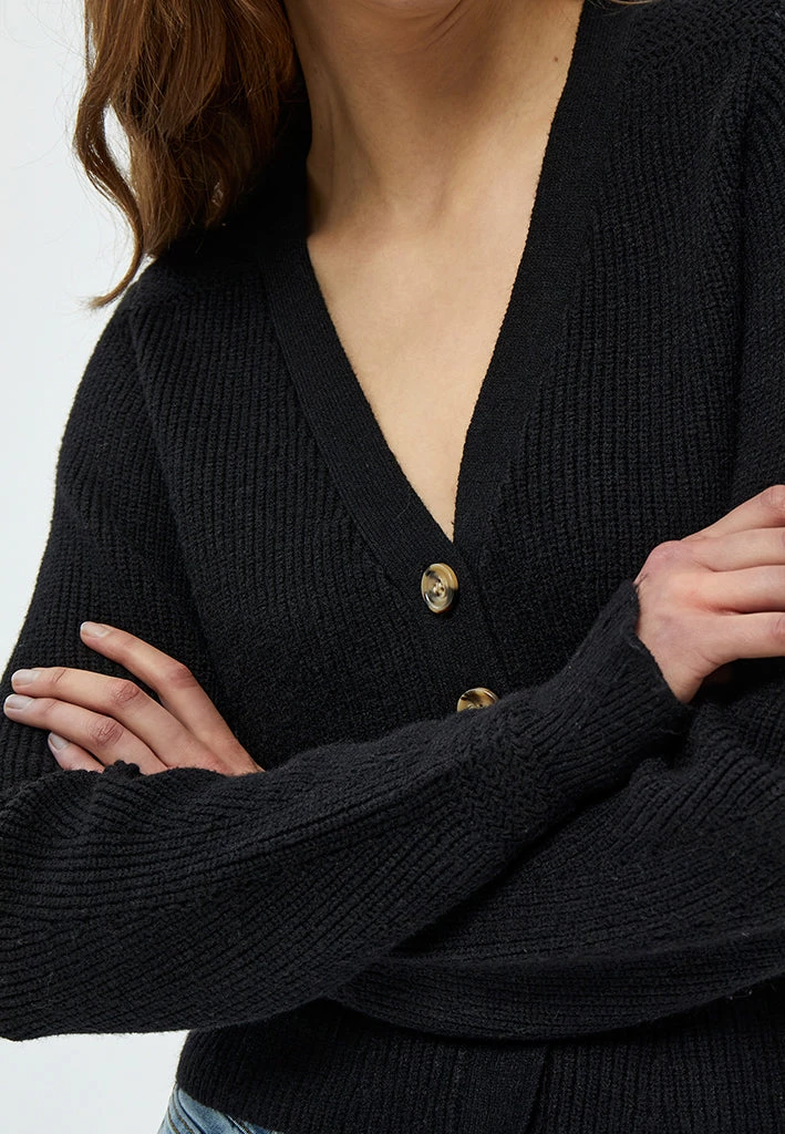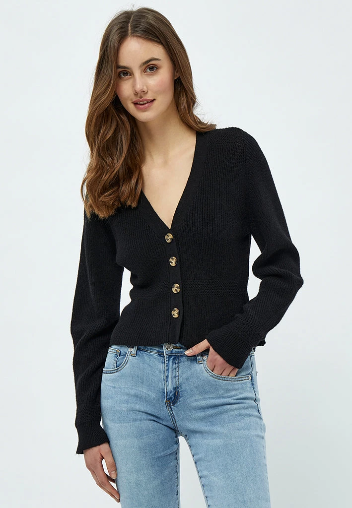 Lovely knit cardigan. The cardigan has long sleeves and is closed by buttons. It has feminin details. It has a v-neck and is tighter at the waist.
