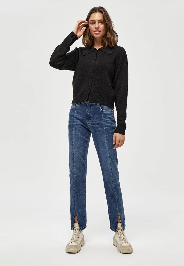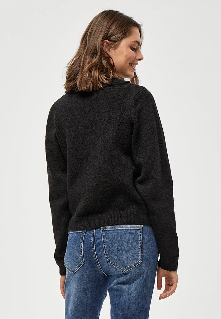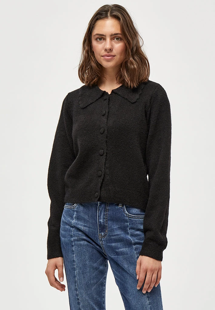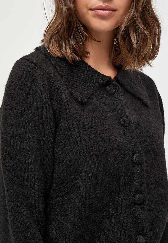 Beautiful cardigan with collar. The cardigan is closed with fabric covered buttons. It is comfortable and stylish.