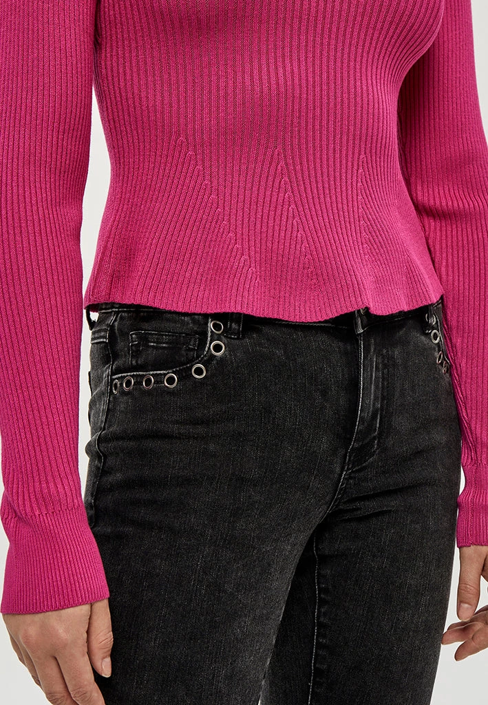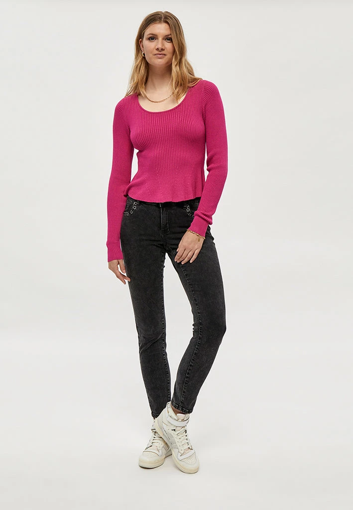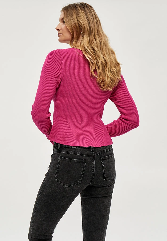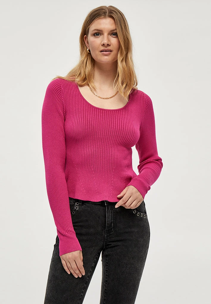 Lovely pullover with rib. The knit has long sleeves and a round neck. It is tighter at the waist giving it a feminin shape.