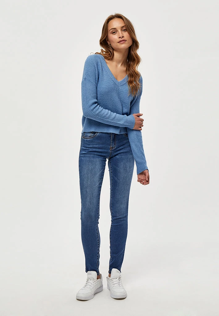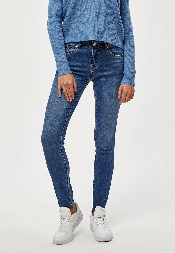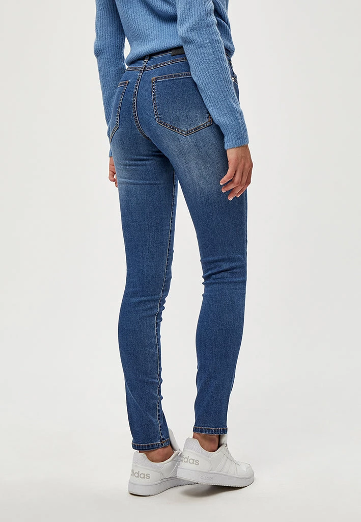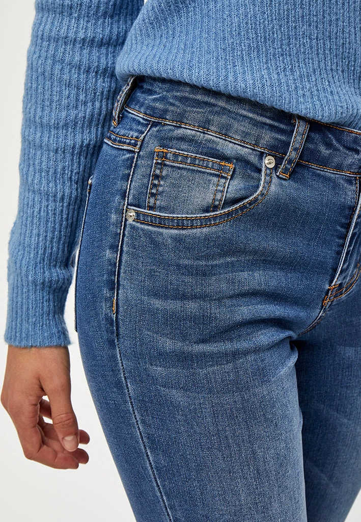 Jeans with zip fly and a mid waist. The jeans are fitted but stretchy. There are five pockets.
