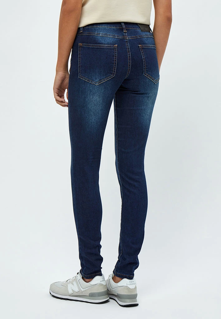 Jeans with zip fly and a mid waist. The jeans are fitted but stretchy. There are five pockets.