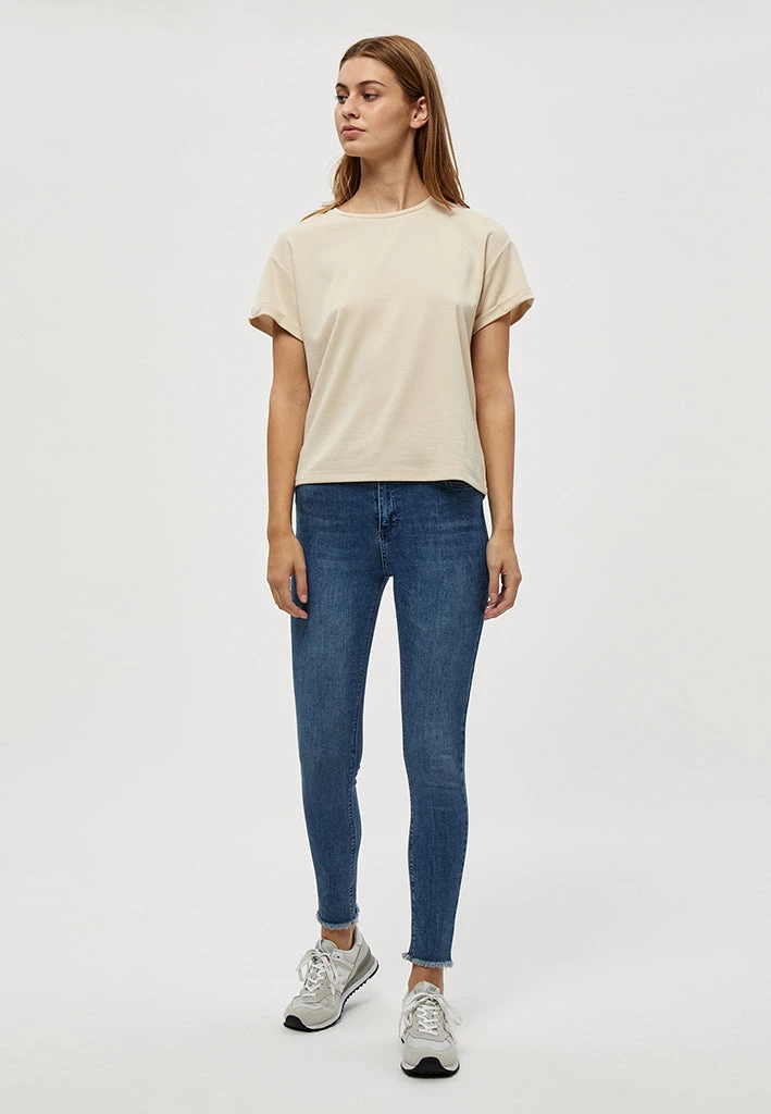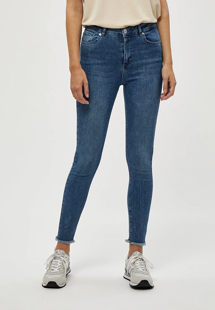 Lovely jeans with a tight fit. The jeans have both front pockets and back pockets. They have belt straps. The jeans have raw edges at the bottom.