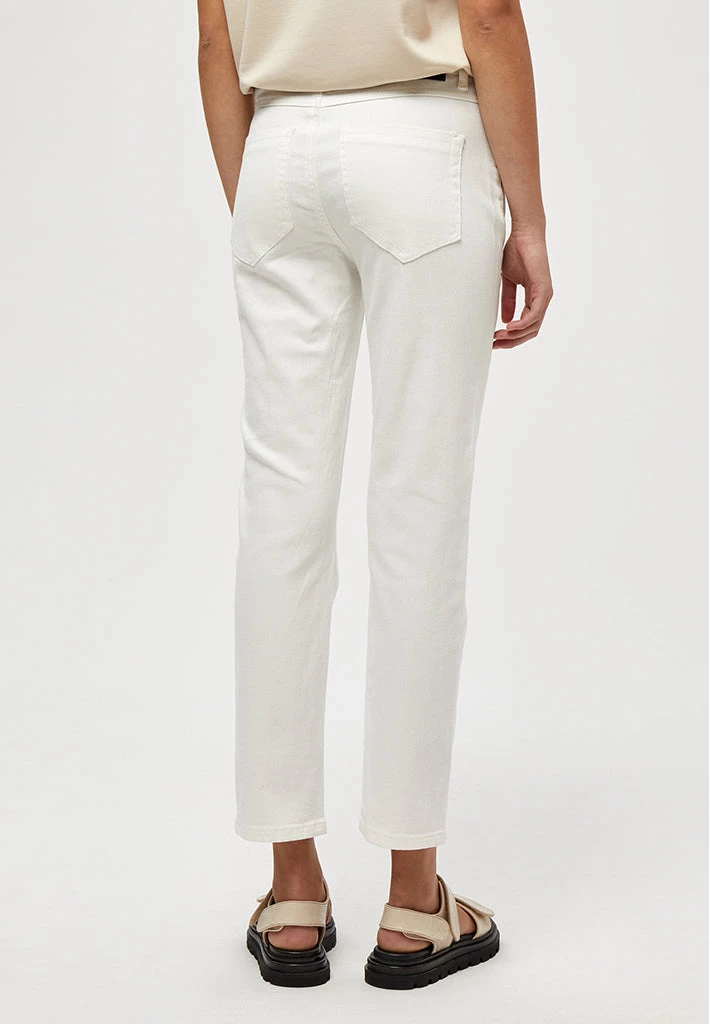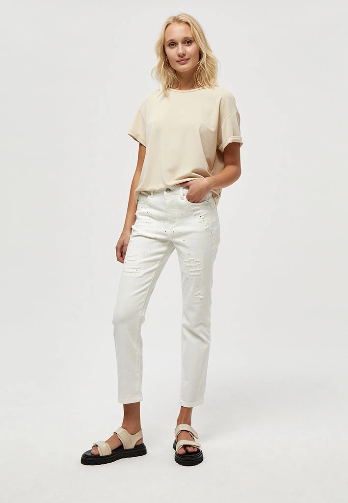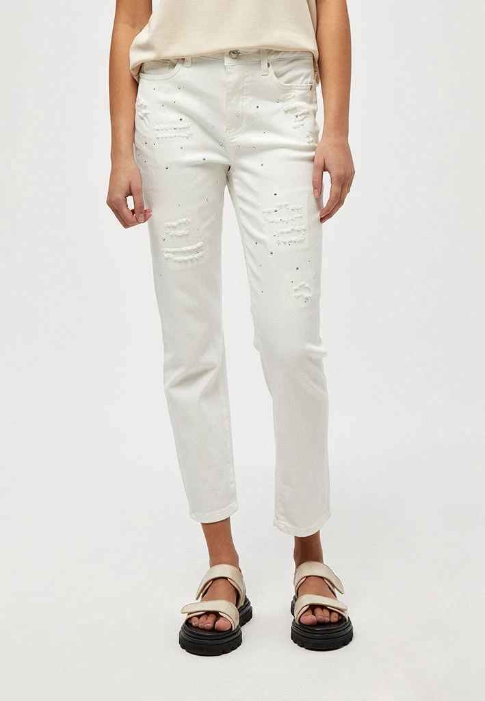 A cool pair of jeans that will add that extra spark to your outfit. The jeans have small sparkling stones and a distressed look on the front while being plain on the back. The jeans has two side pockets, two back pockets and a zipper.