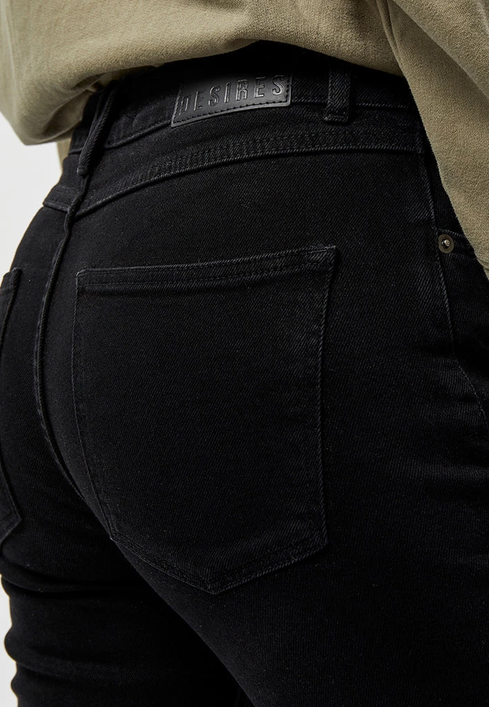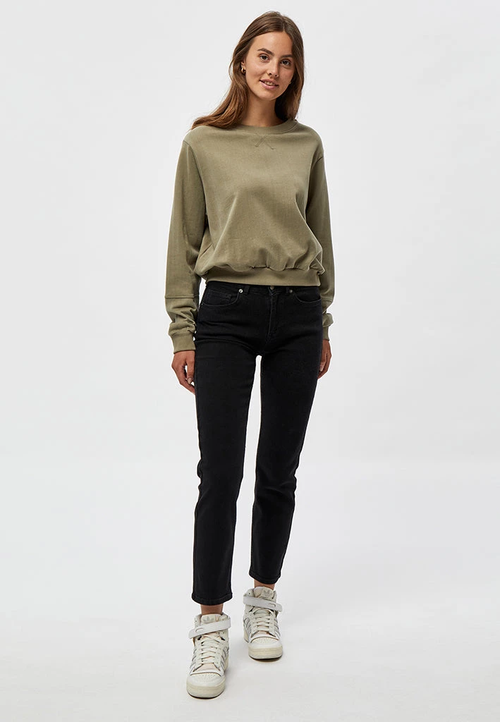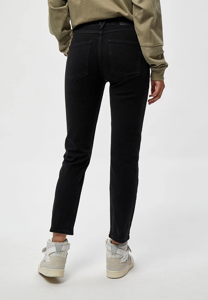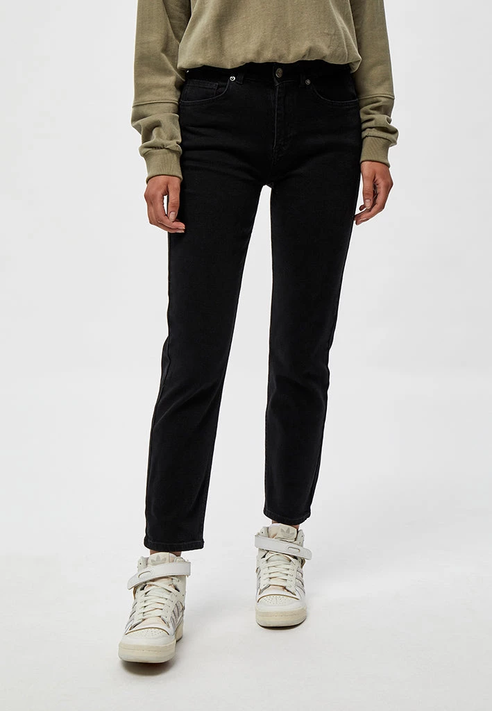Jeans with zip fly and a mid waist. The jeans have a regular fit and are ankle length. There are five pockets.