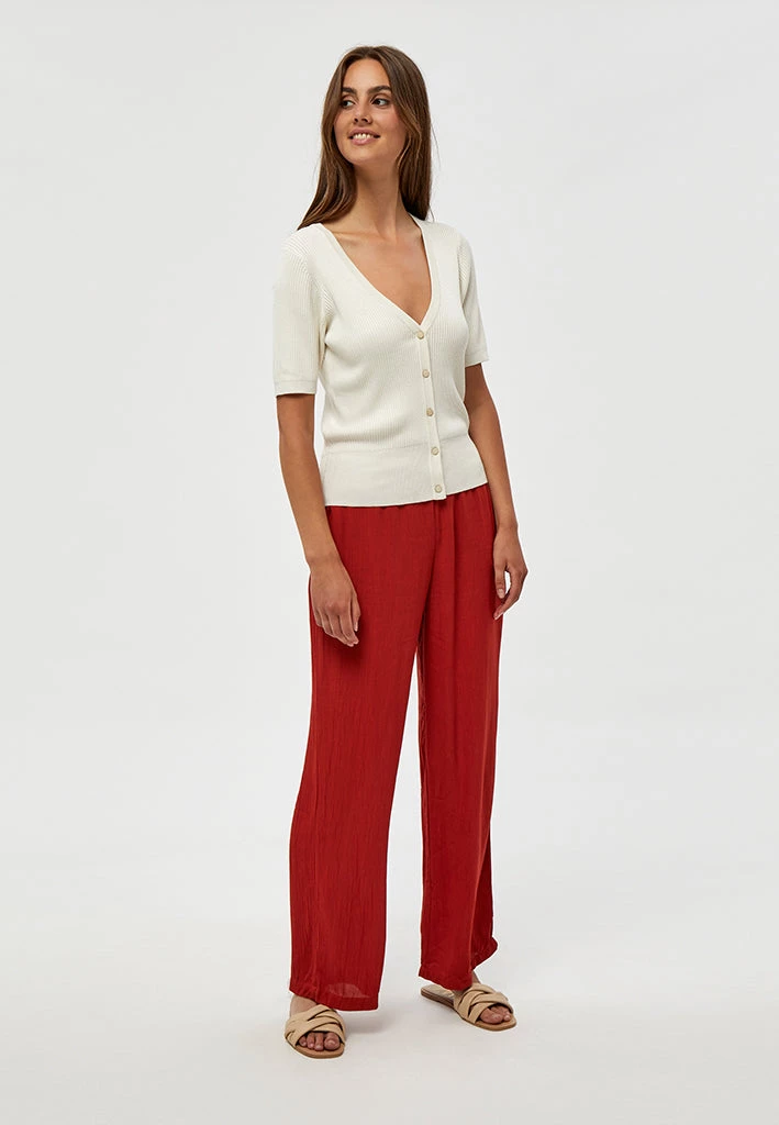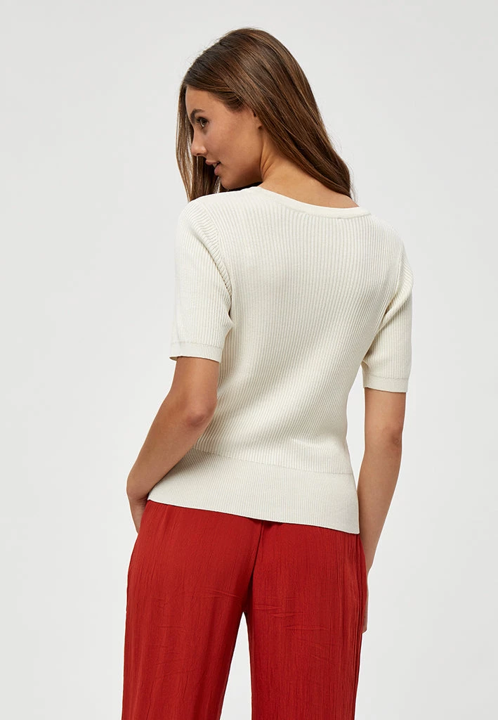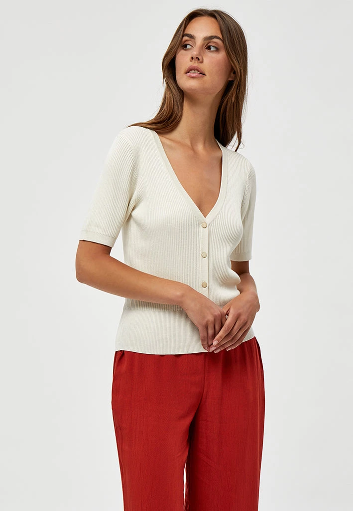 A beautiful short sleeves cardigan in rib material made from 80% sustainable viscose (EcoVero). The cardigan has a bohemian expression with the v-neck and wooden buttons.
