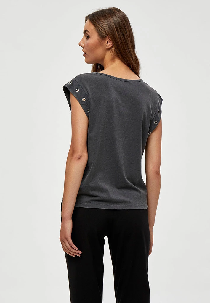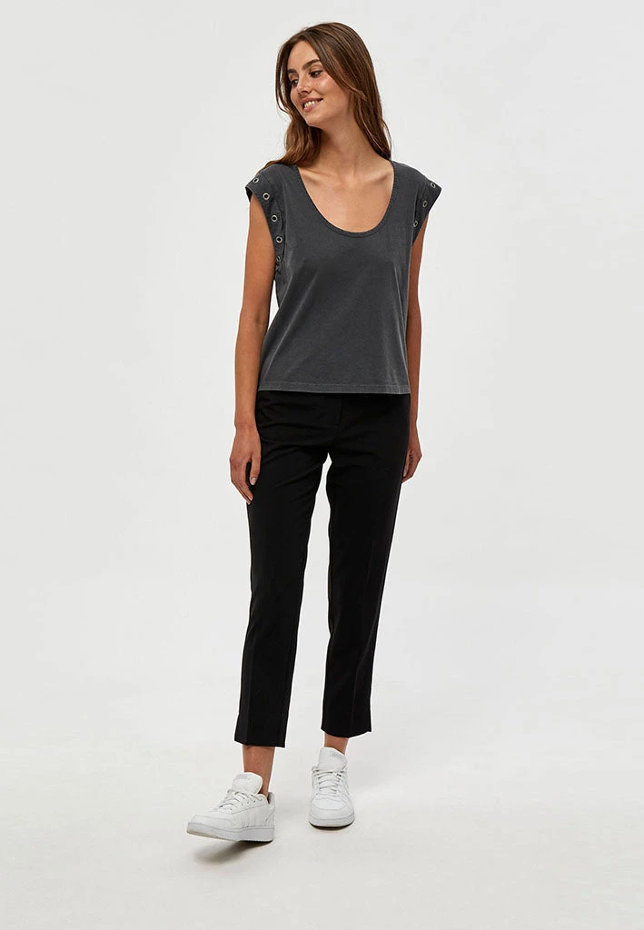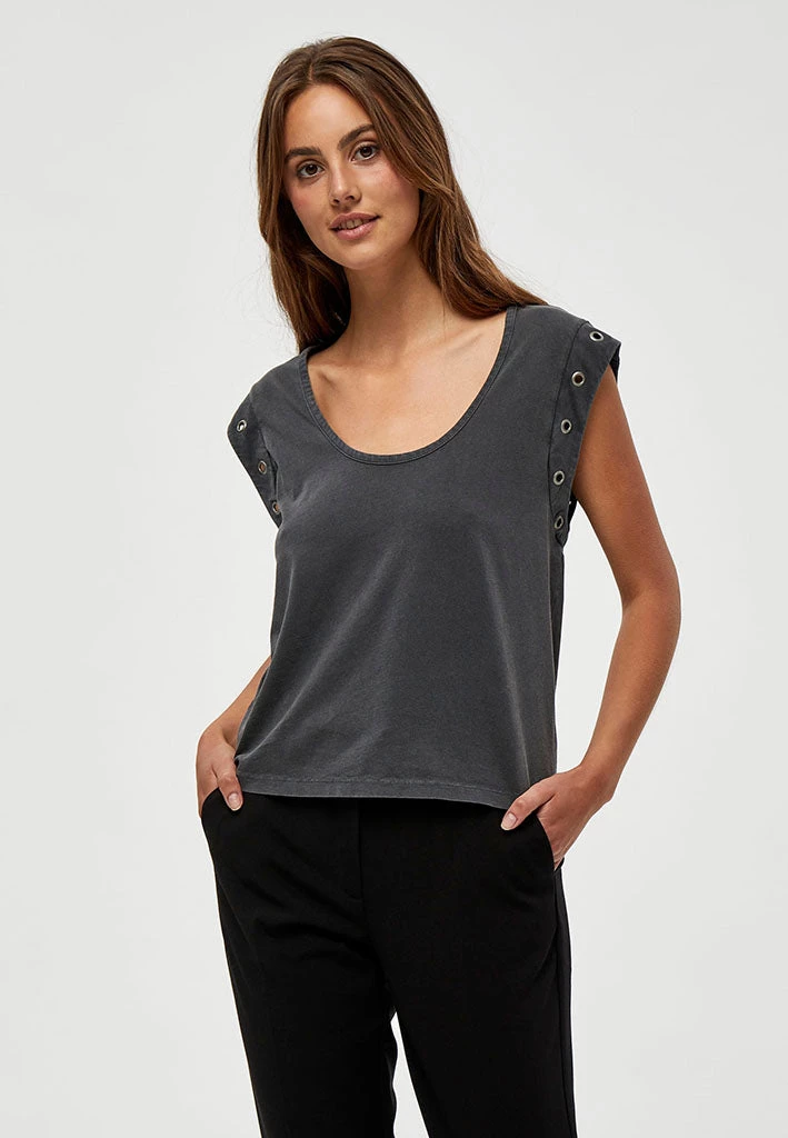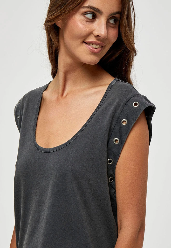 A cool black washed top with no sleeves. It has nice stud details and a round neckline. The top is made from 100% cotton which makes it iron-free.