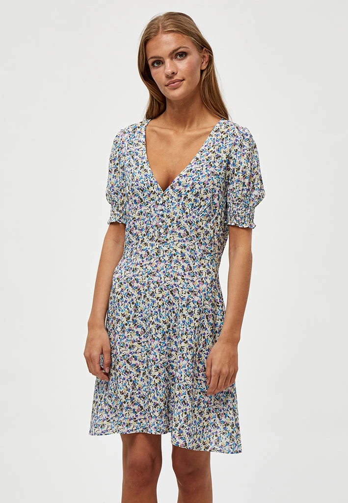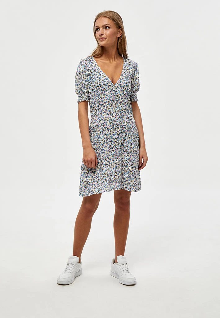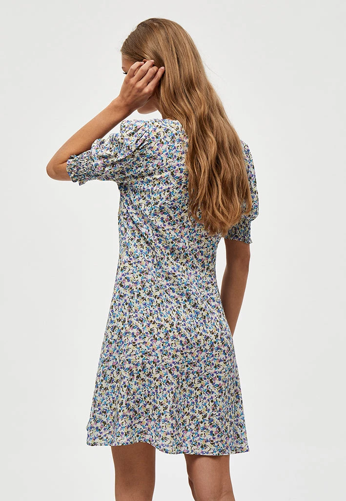 A dress perfect for spring and summer with its beautiful flowerprint. It has smock details on the sleeves, a v-neck and buttons down to the waist. The materials are made from 100% sustainable materials.