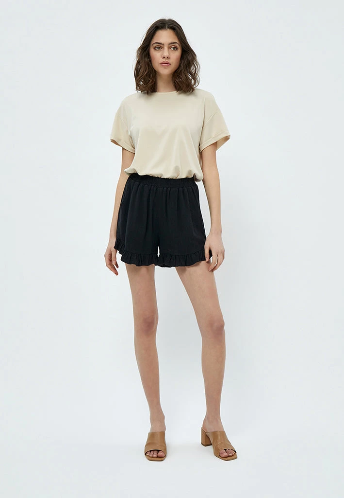 The most comfortable linen shorts with ruffles at the buttom. It has side pockets and an elastic band at the waist to make them super comfortable.