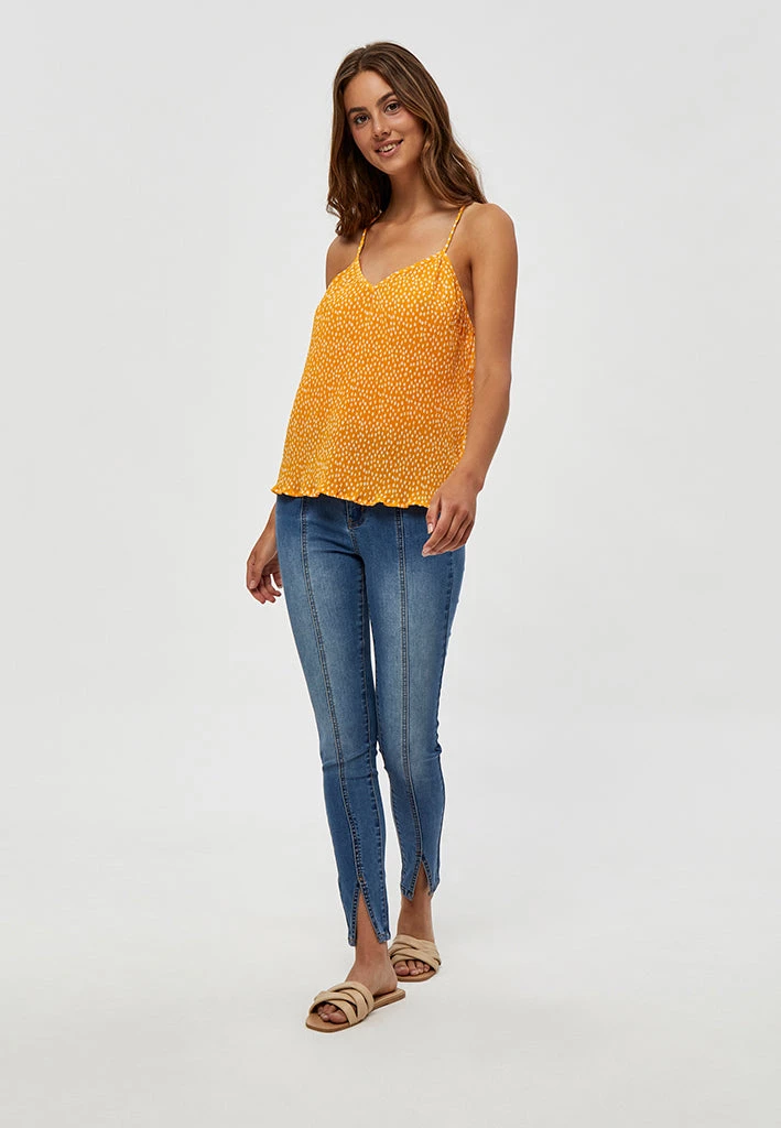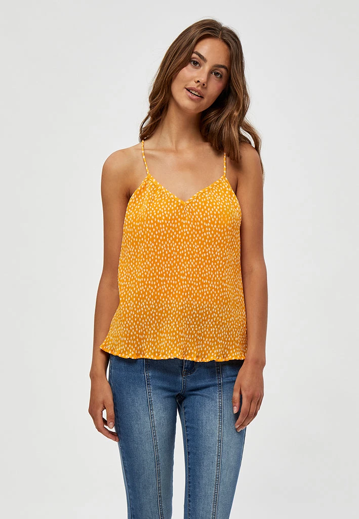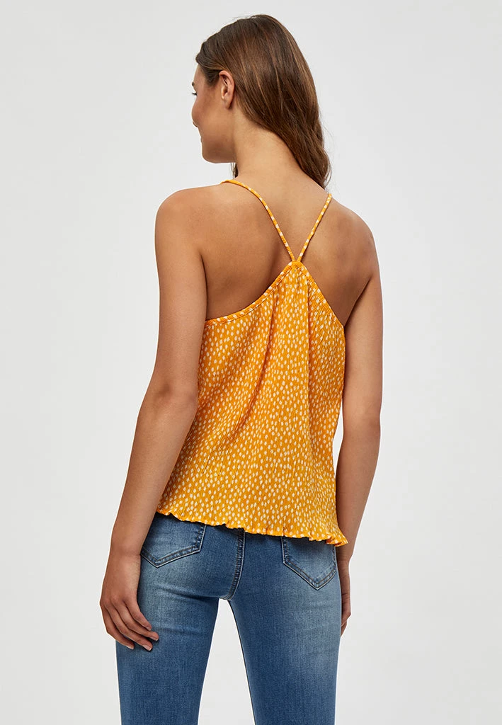 Beautiful radiant yellow top in floral print. The top has a V-neck and a crossover back in a special texture. Perfect for spring and summer with either skirts or jeans.