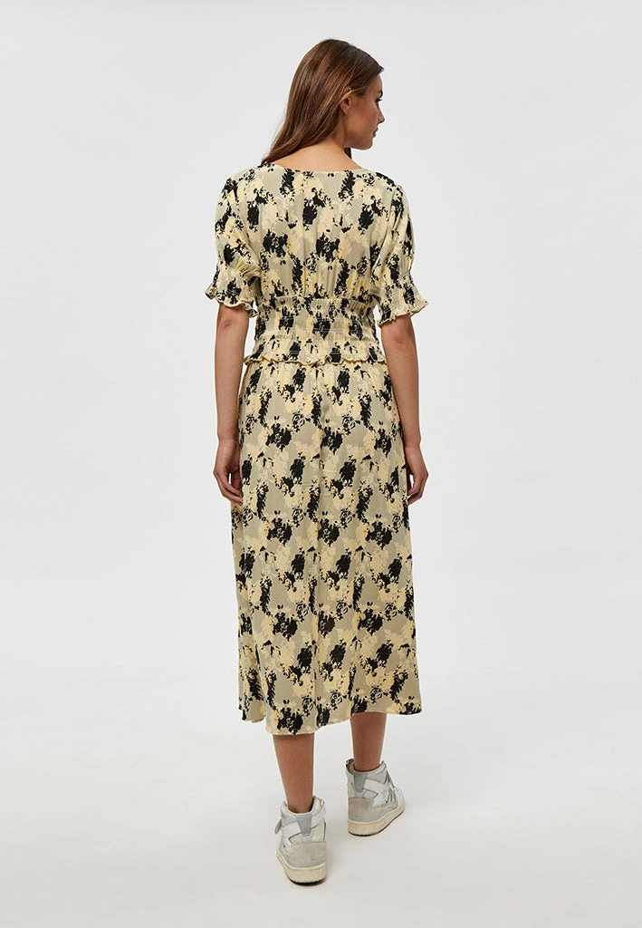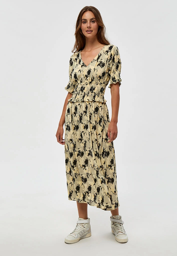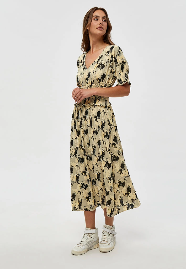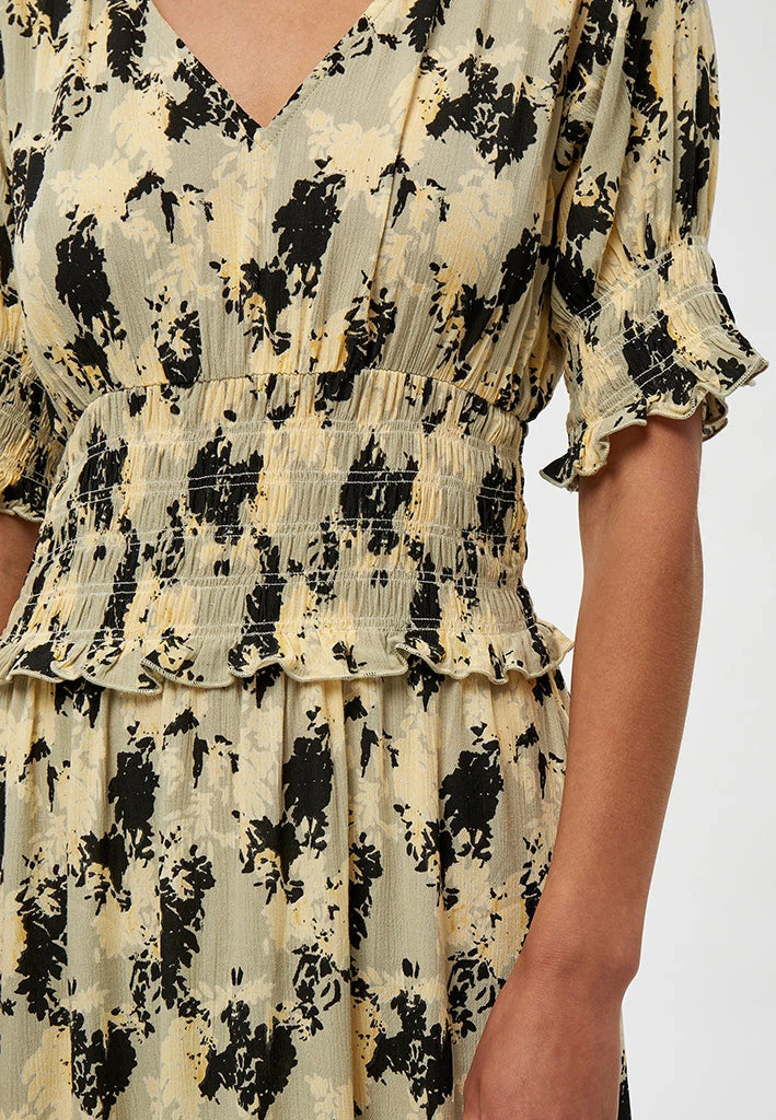 Cool maxi dress with smock details and ruffles at the waist and sleeves. It has a beautiful flowerprint with a v-neckline. The dress is made from 100% sustainable materials.