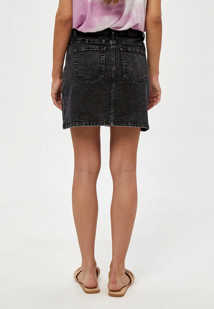 The perfect black washed denim skirt that goes with every outfit for spring and summer. It has silver studs on the pockets which adds a nice detail.