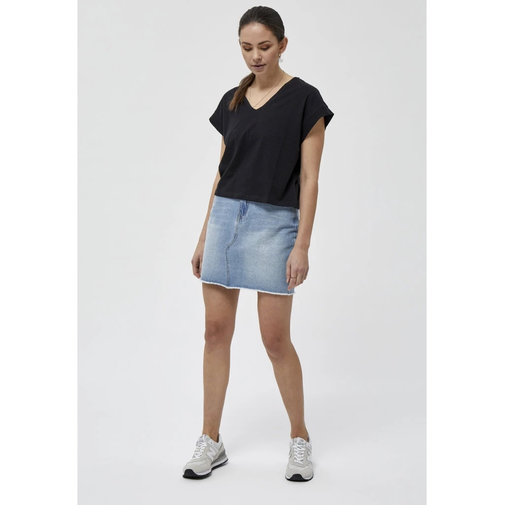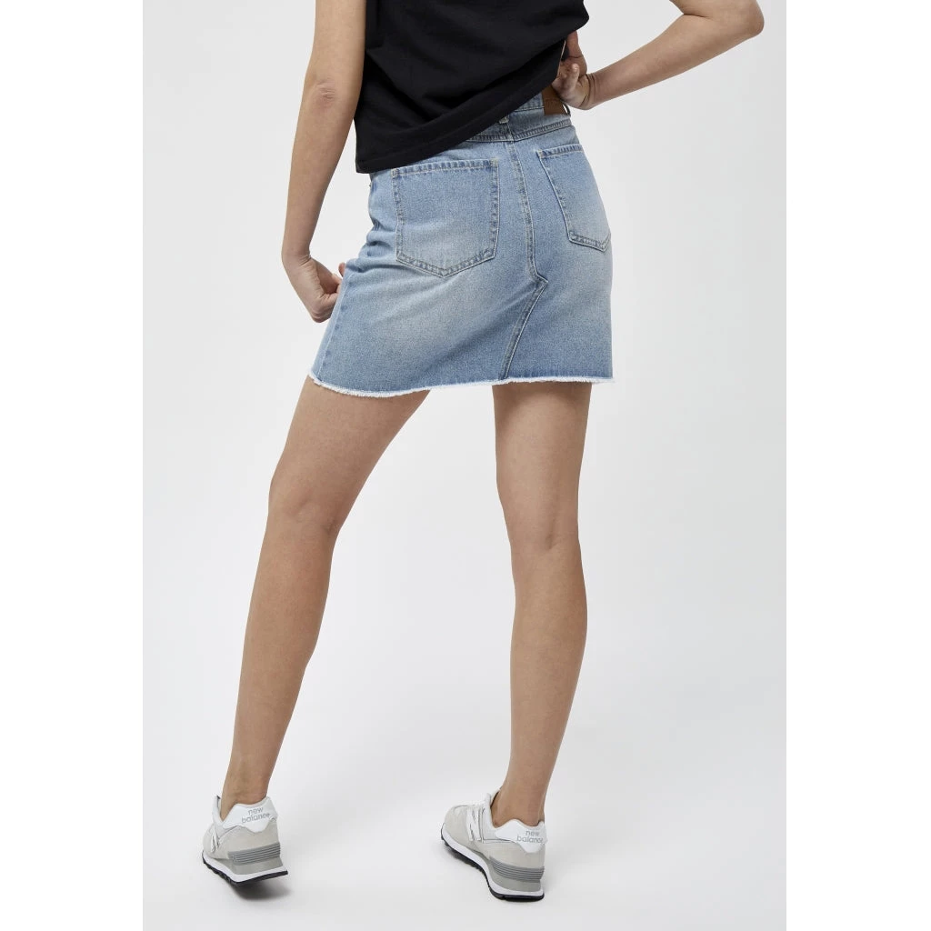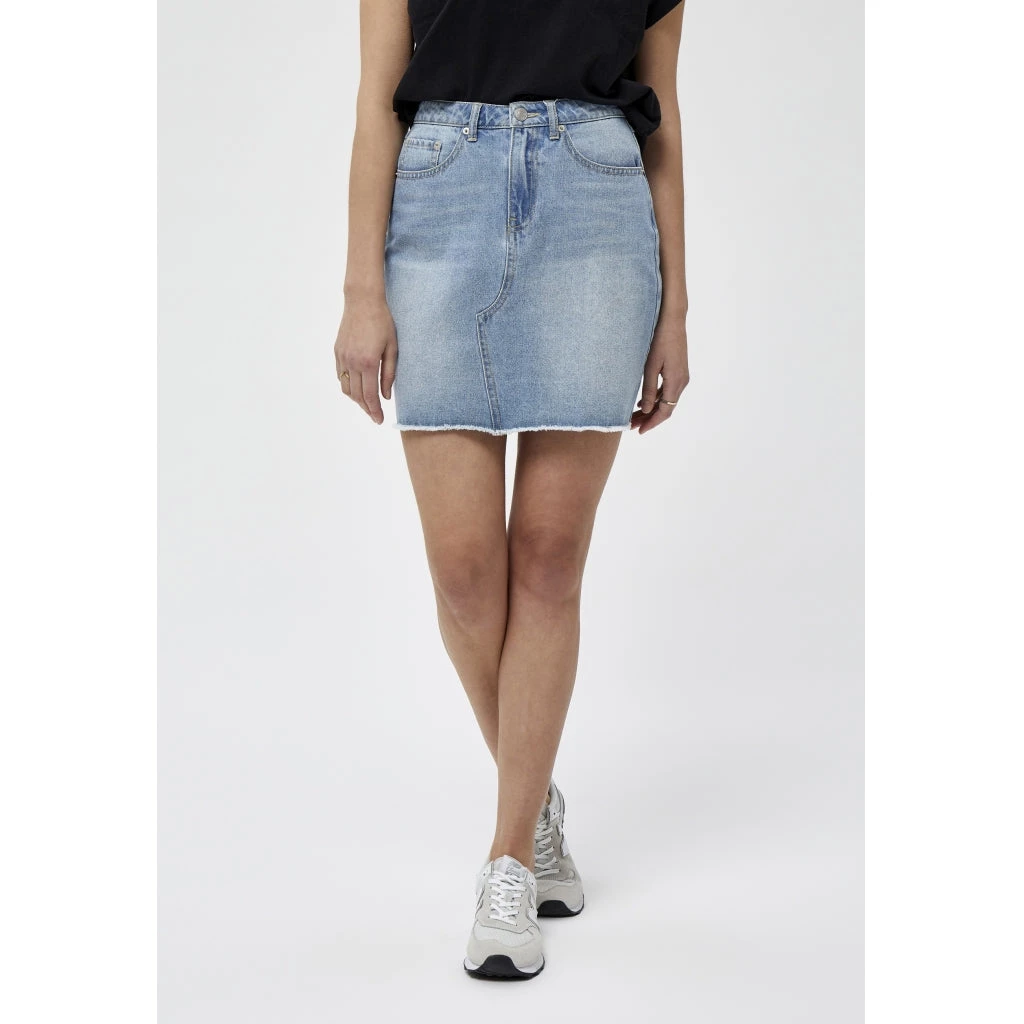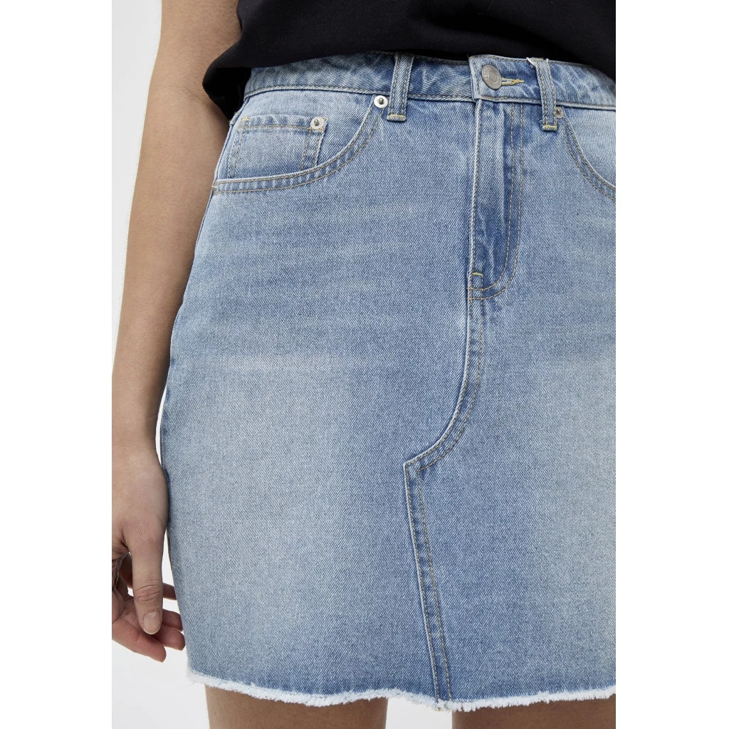 Lovely and simple denim skirt. The skirt has pockets, belt straps and a rough edge at the bottom. It is easy to style and perfect for sunny days.