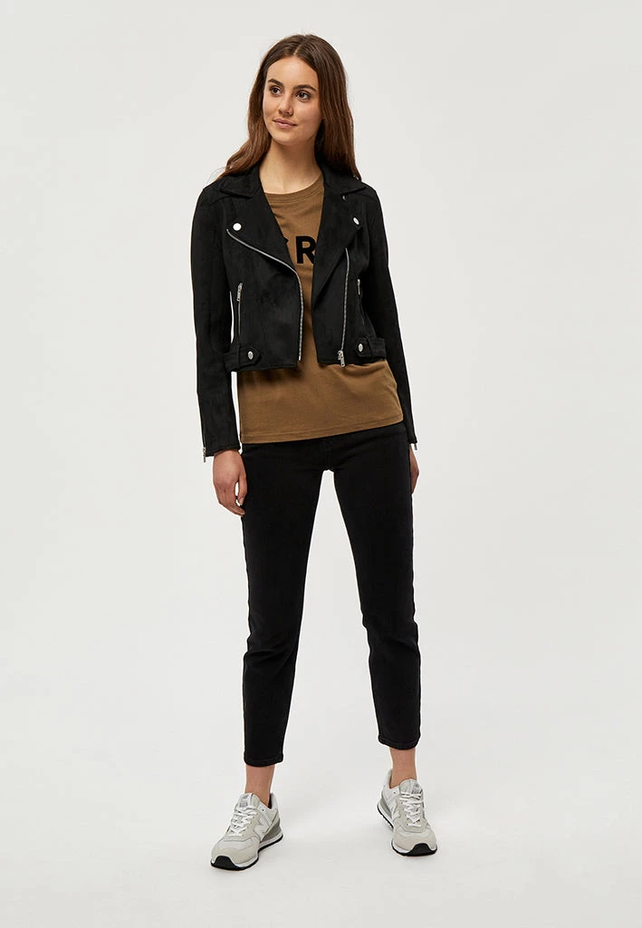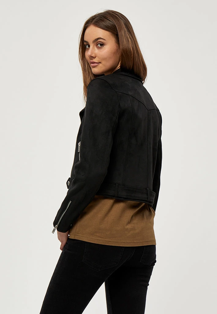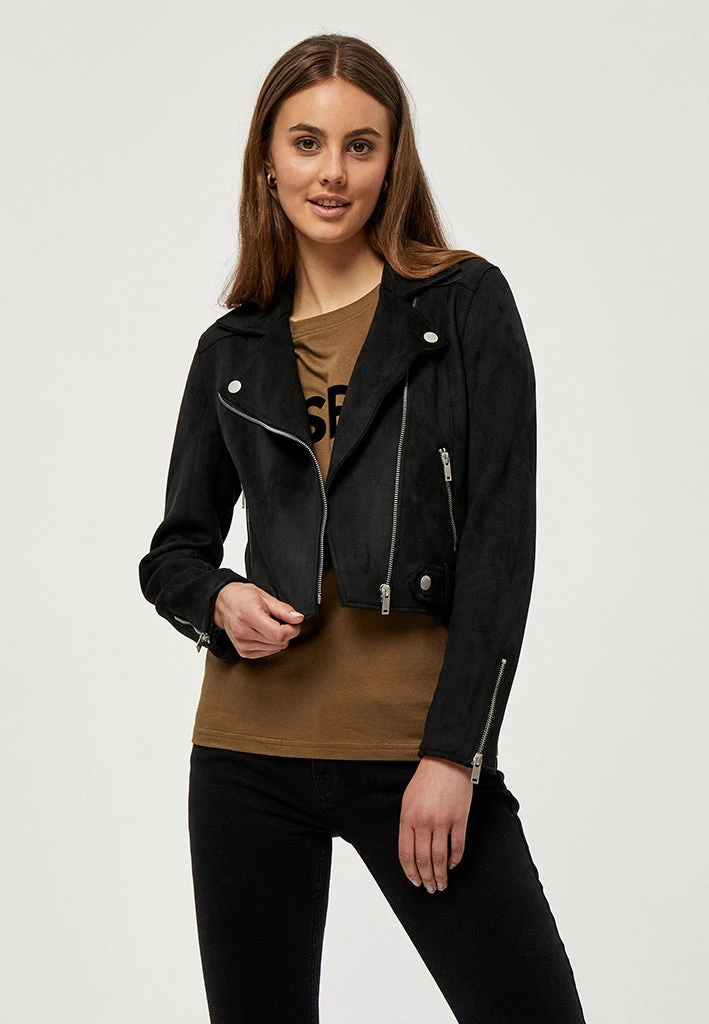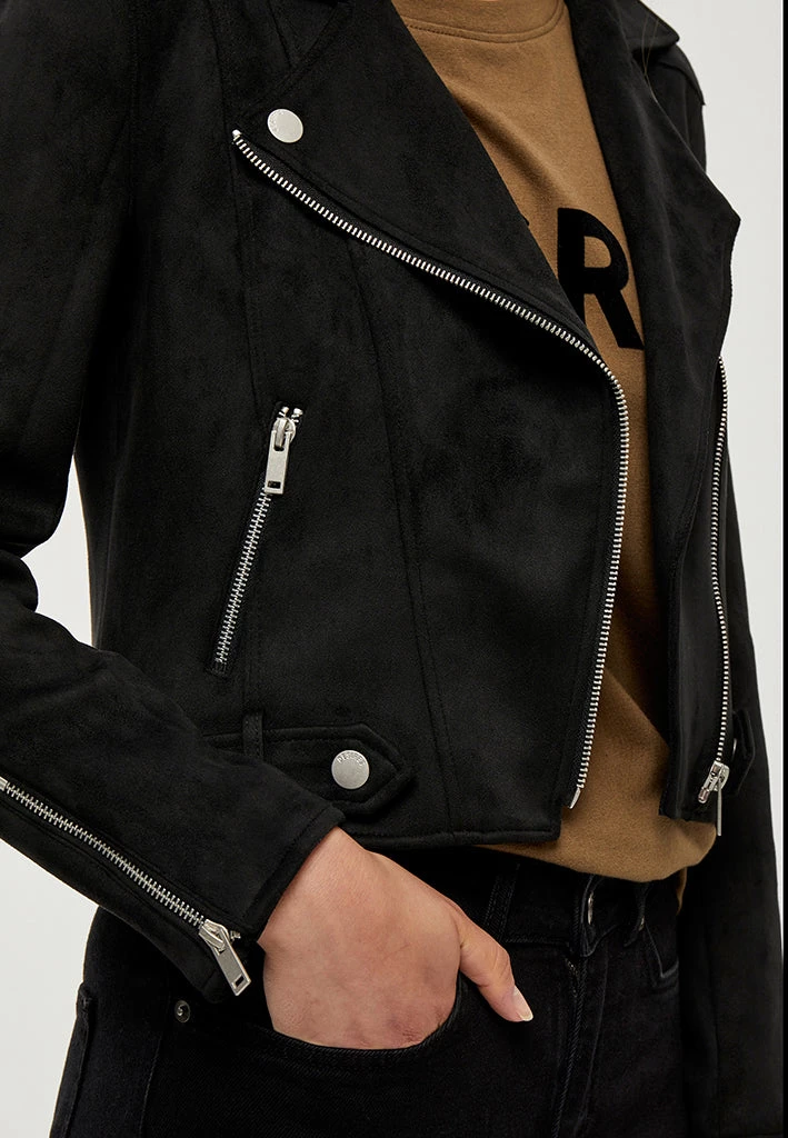 Cool biker jacket with a lot of details. The jacket has an asymmetrical zipper at the front, zippered pockets at the side and sleeves, and collar with push buttons. The material is soft smooth velour, which makes the jacket it’s very own.