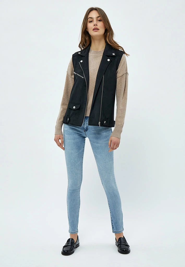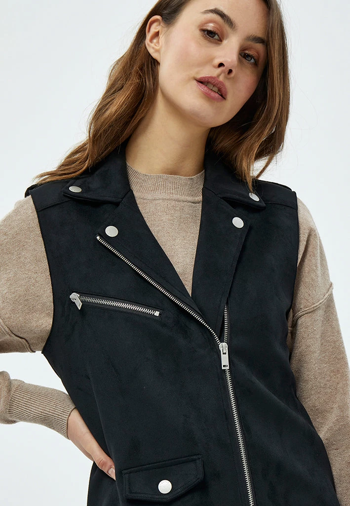 Lovely vest. The vest has a collar and lots of cool details. The vest is closed by zipper and a belt at the bottom.