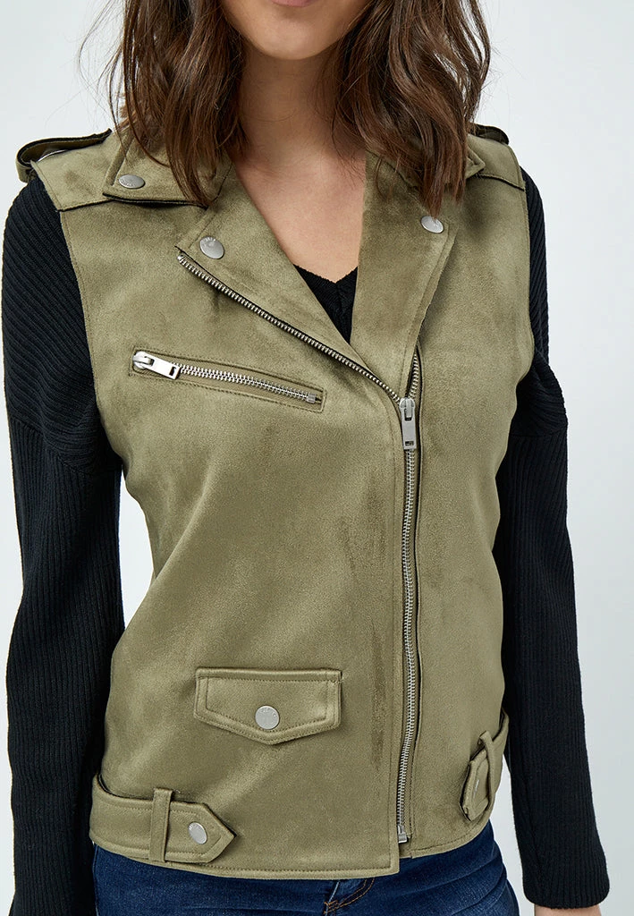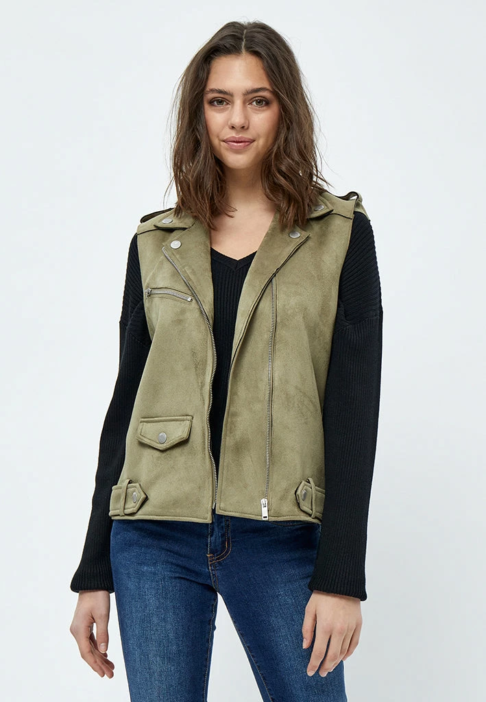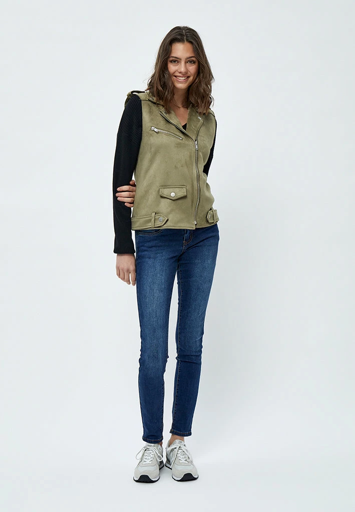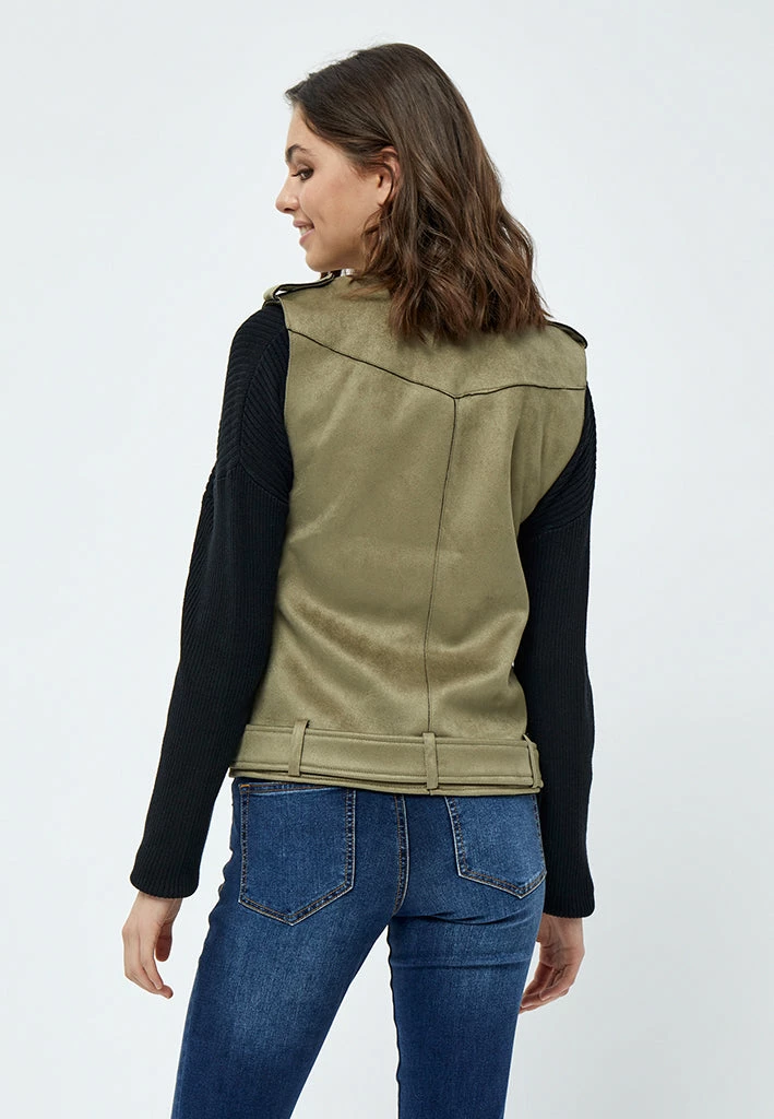 Lovely vest. The vest has a collar and lots of cool details. The vest is closed by zipper and a belt at the bottom.