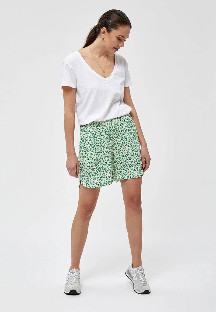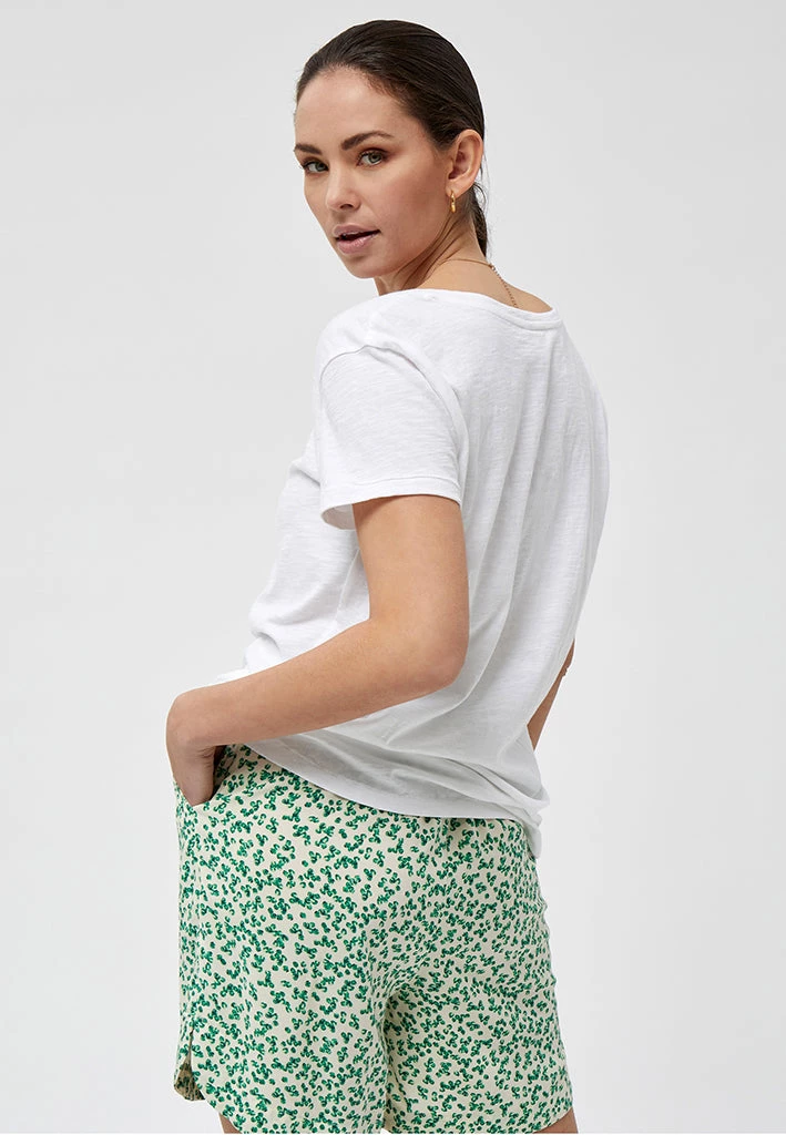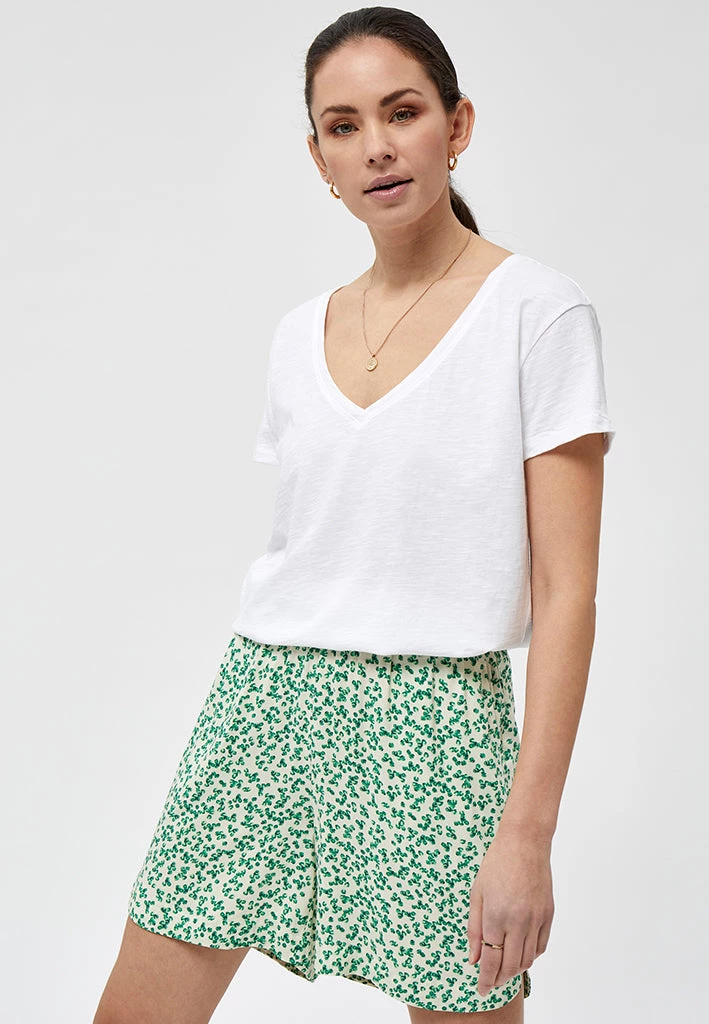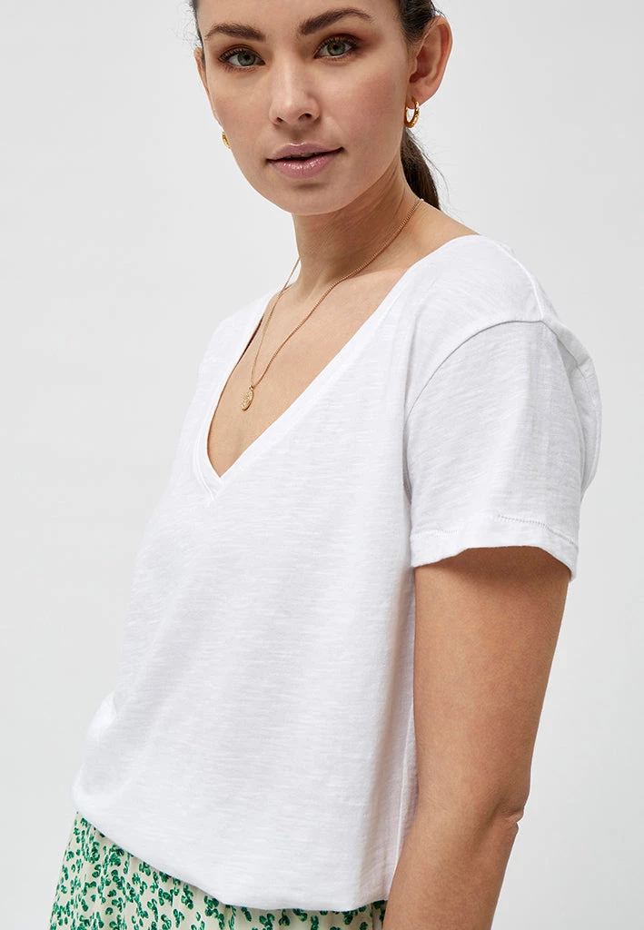 Lovely and simple tee. The tee has a deep v-neckline and short sleeves.
