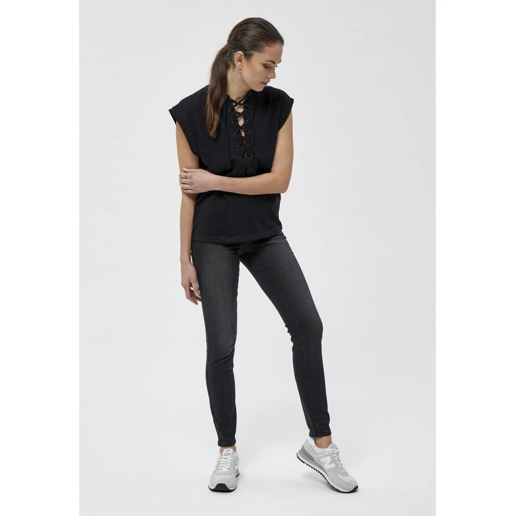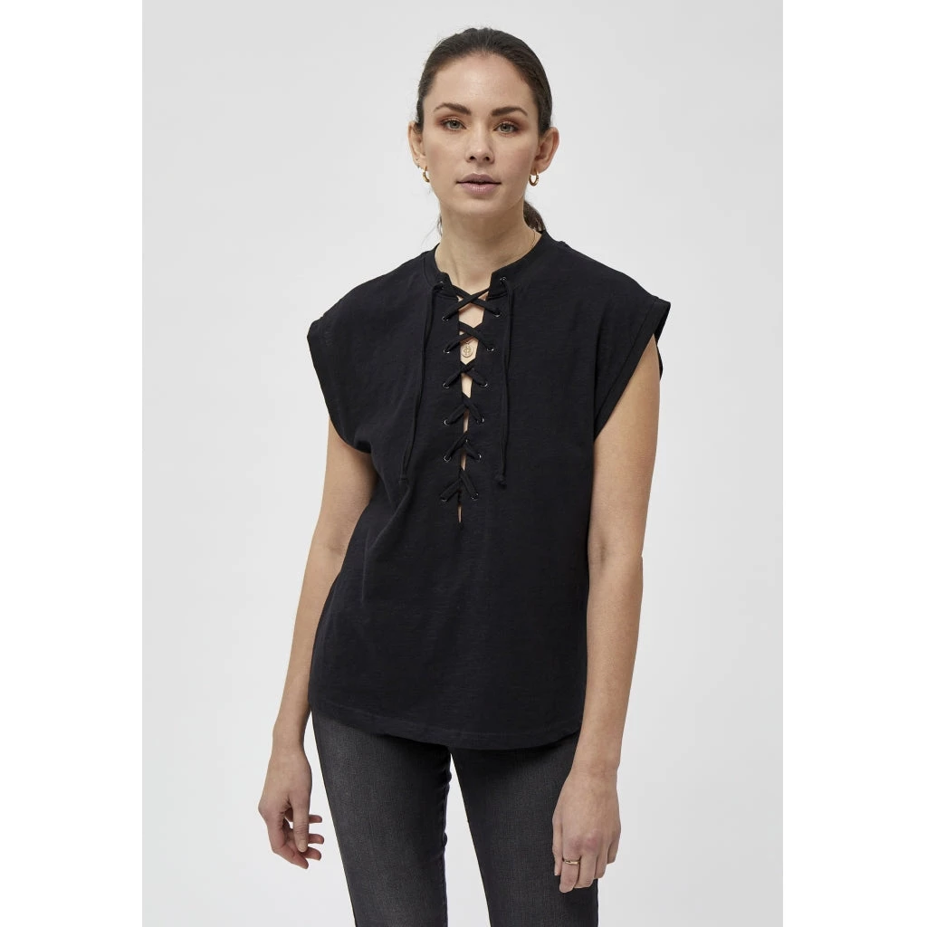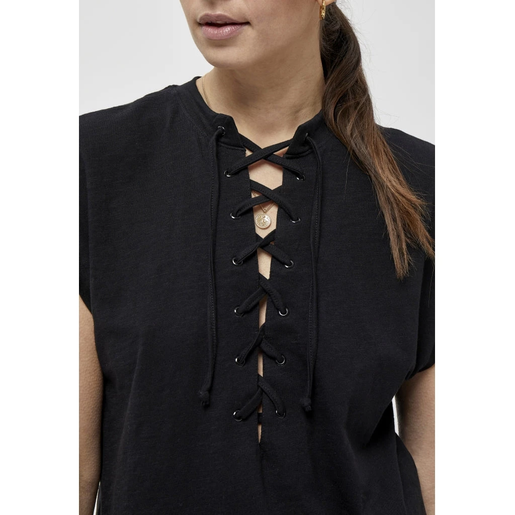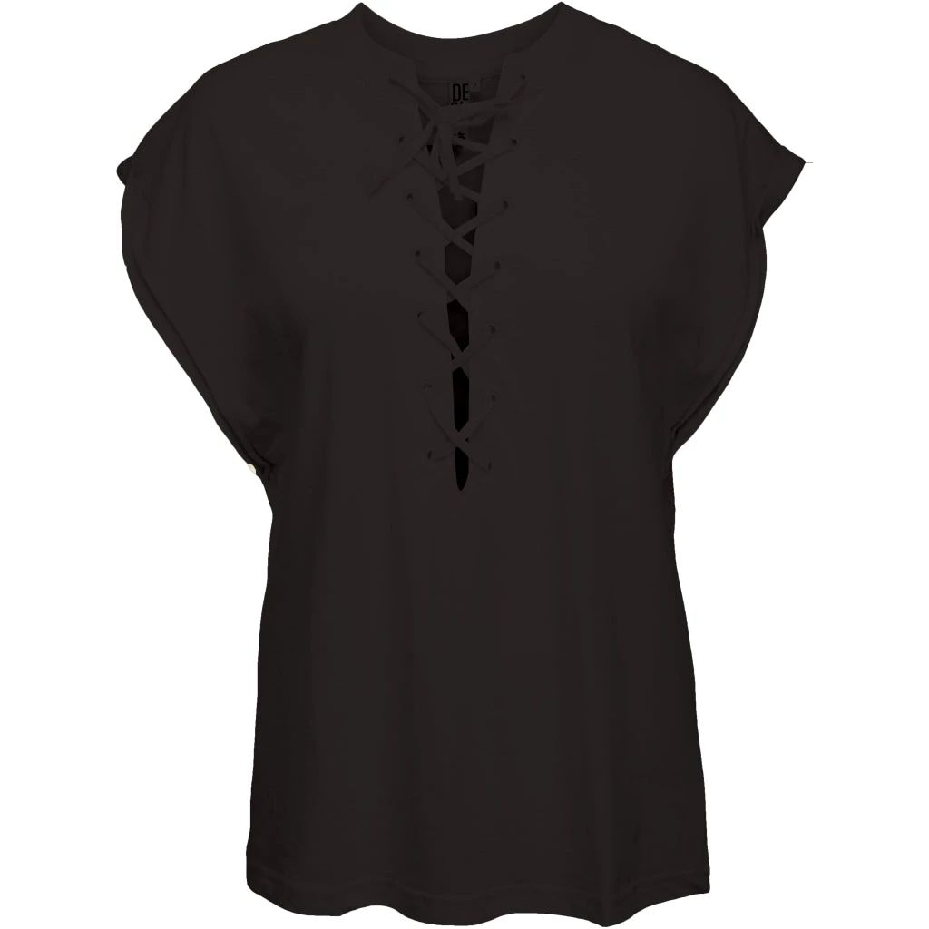 Cool tee with short and broad sleeves. It has a deep neckline with a lace up detail.