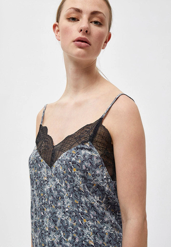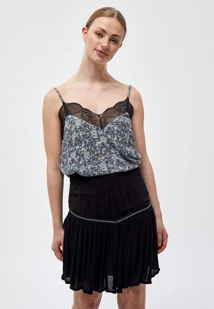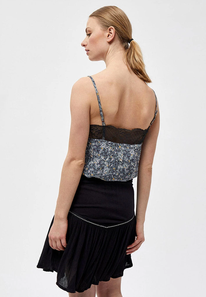 Lovely top with thin straps. The top has a blue color with a nice print. It has lace at the top which makes the top more feminin and beautiful.